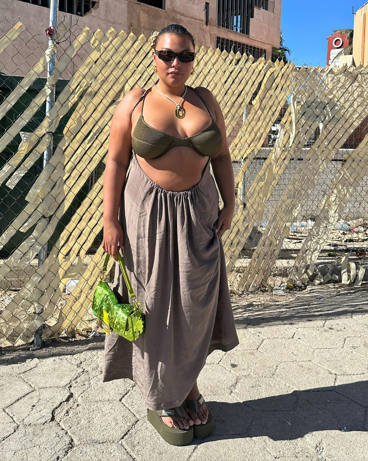 American model Paloma Elsesser shared her goddess-glamour look during a sunny New Year’s trip with her girlfriends. Her earth-toned draped skirt perfectly complemented her olive-green ribbed bikini top and platform sandals. Elsesser added a touch of sparkle by accessorizing with her acid-green sequined Fendi Baguette bag.