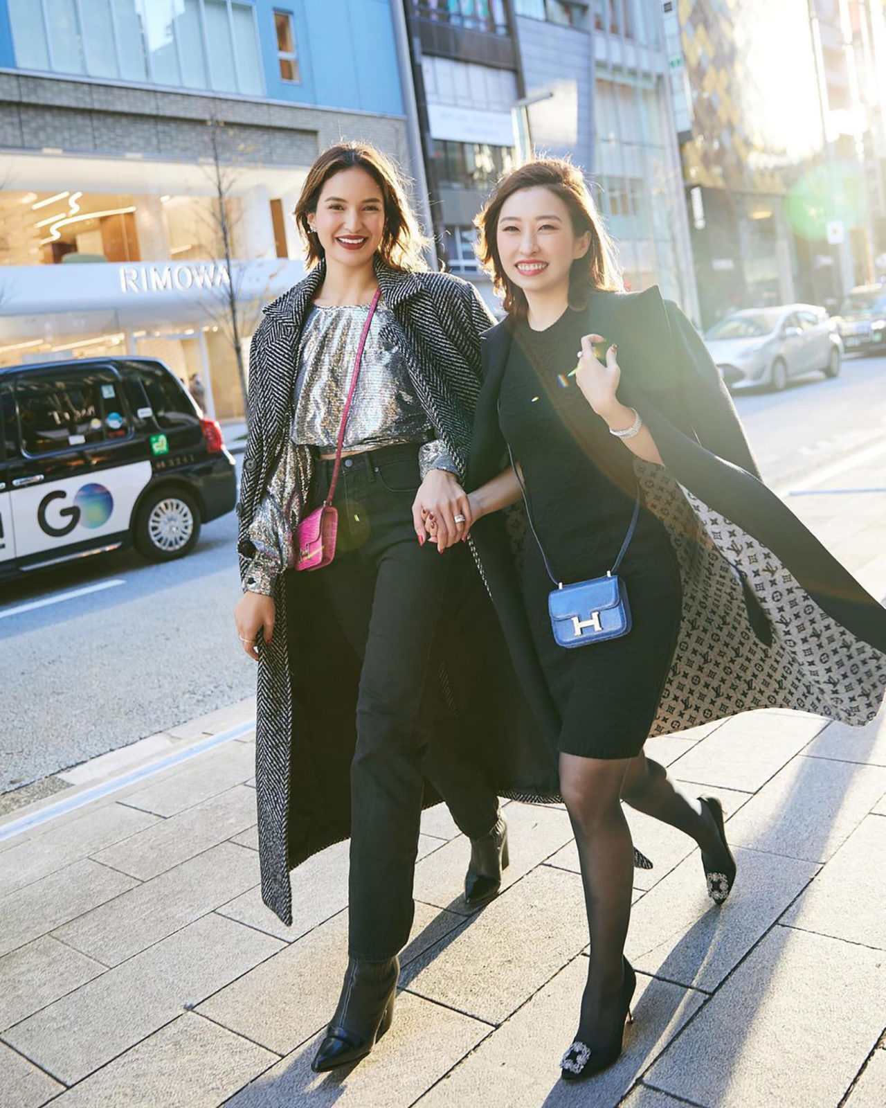 Filipino-Moroccan-Swiss actress Sarah Lahbati shared photos of with her friend Xiaoma, founder of Ginza Xiaoma, on a holiday trip to Tokyo. Lahbati dawned a sparkling silver balloon-sleeve top under a large coat and a hot pink Hermès Constance bag for a pop of color.