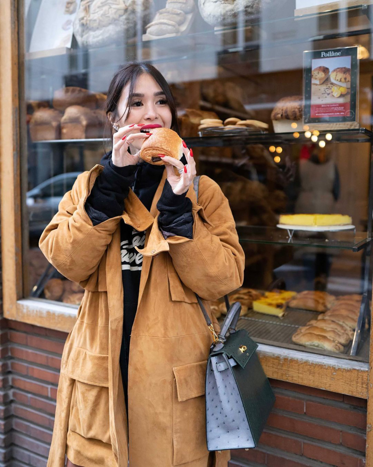 The ever-fashion-forward actress and entrepreneur Heart Evangelista is taking on a key trend for Spring 2023 while munching on a pain au chocolate during her recent trip to Paris; cargo pockets. Evangelista elevated her utilitarian suede jacket and hoodie with an ostrich leather Hermes Kelly bag, dainty jewelry, and red lipstick.