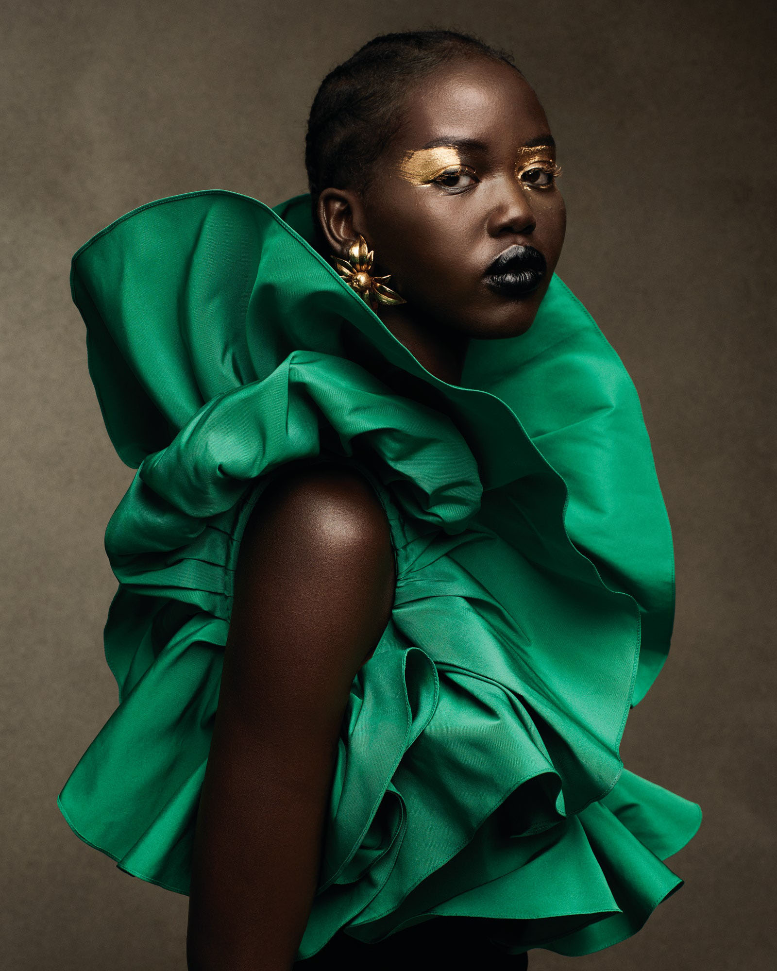 Adut Akech in a ruffled Alexander McQueen top Photographed by Ethan Green, Vogue, May 2021