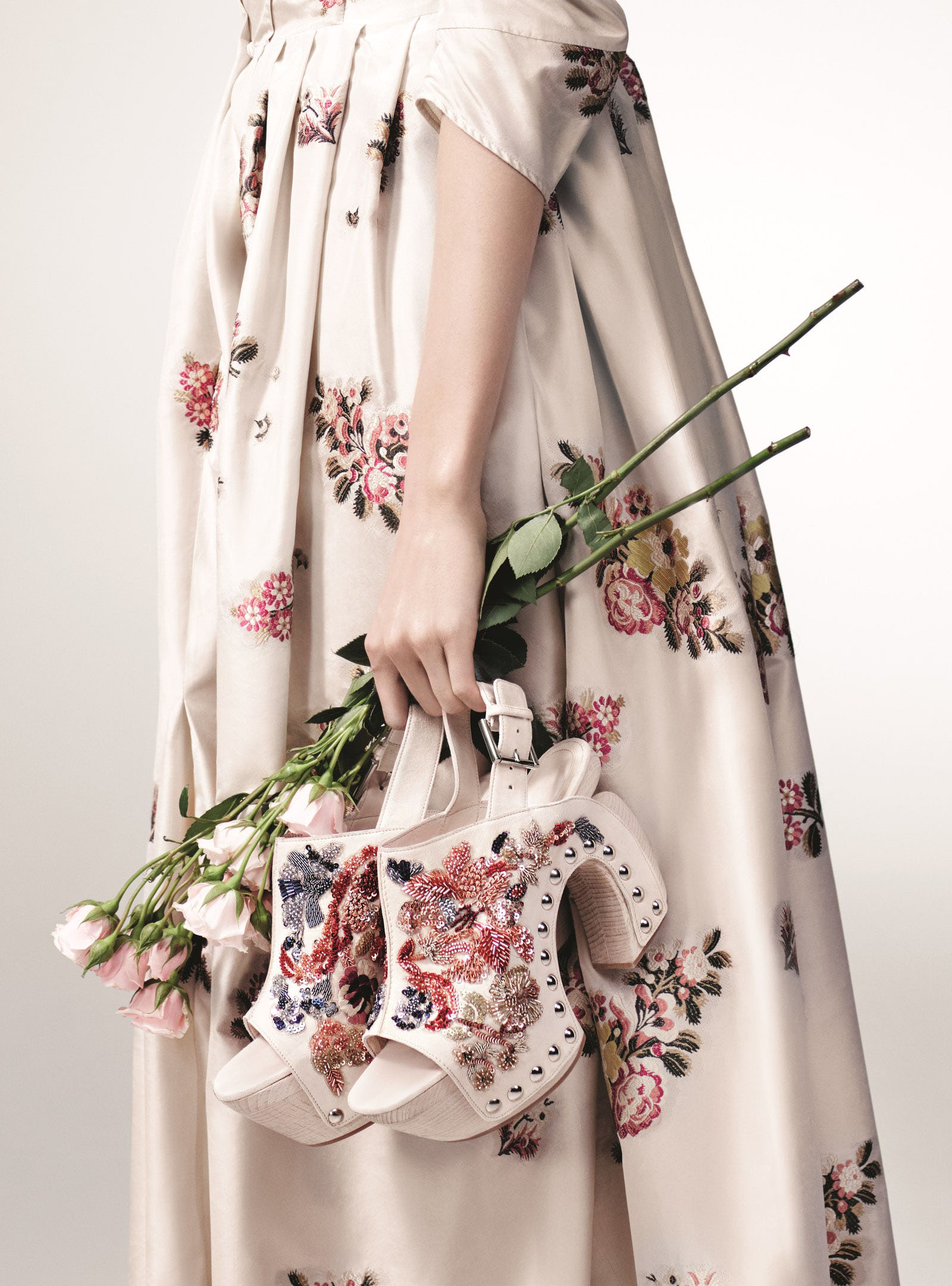 Alexander McQueen wood-platform clogs and silk-jacquard dress Photographed by Willy Vanderperre, Vogue, March 2016