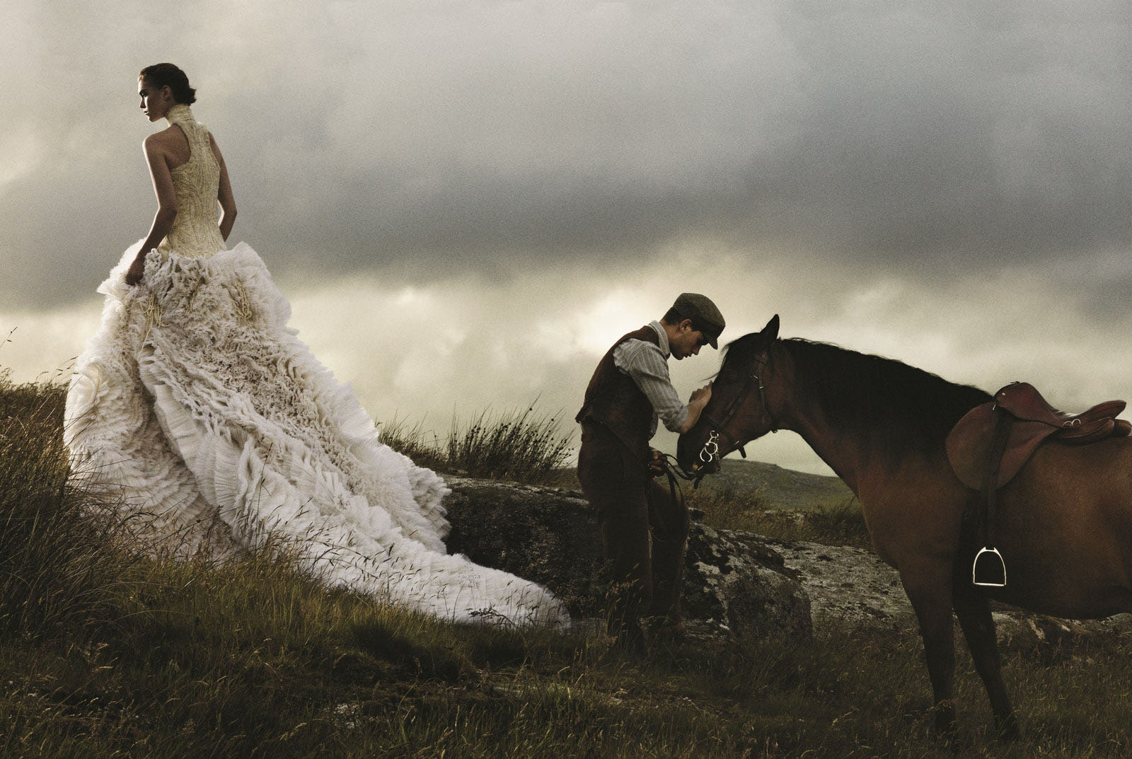 Arizona Muse, in an embroidered tulle-and-pleated organza dress by Alexander McQueen, with Jeremy Irvine Photographed by David Sims, Vogue, November 2011