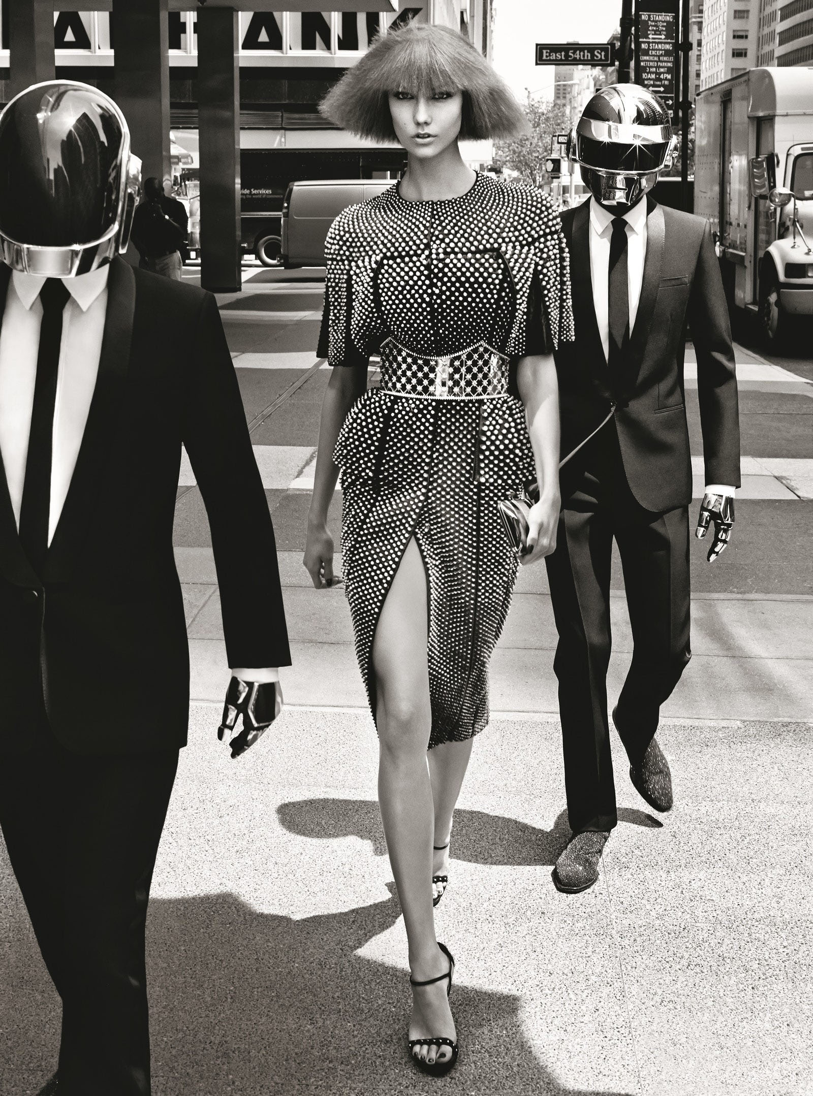 Karlie Kloss in a pearl-embellished coatdress by Alexander McQueen with Guy-Manuel de Homem-Christo and Thomas Bangalter of Daft Punk Photographed by Craig McDean, Vogue, August 2013