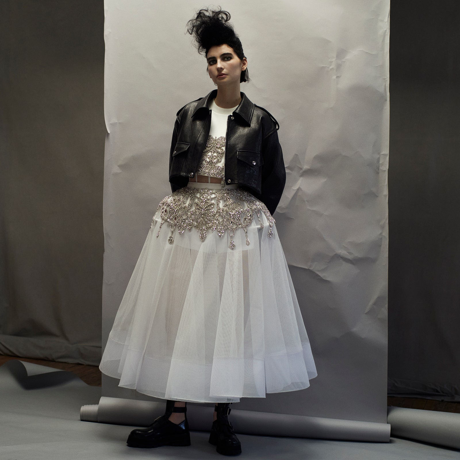 Meadow Walker in an Alexander McQueen jacket, top, skirt, and boots Photographed by Ethan Green, Vogue, March 2022