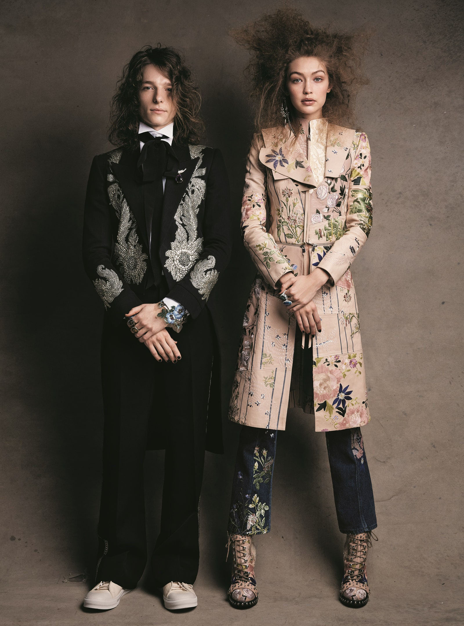 Mike Faist, in an Alexander McQueen tailcoat, trousers, rings, and sneakers, with Gigi Hadid in an Alexander McQueen leather coat, embroidered jeans, earring, and boots Photographed by Patrick Demarchelier, Vogue, April 2017