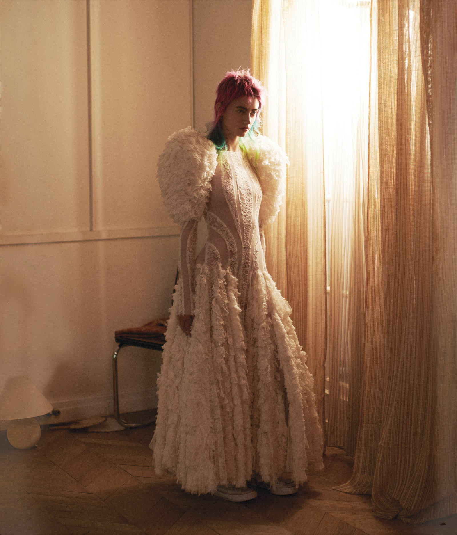 Patrycja Piekarska in an Alexander McQueen lace dress Photographed by David Sims, Vogue, March 2020