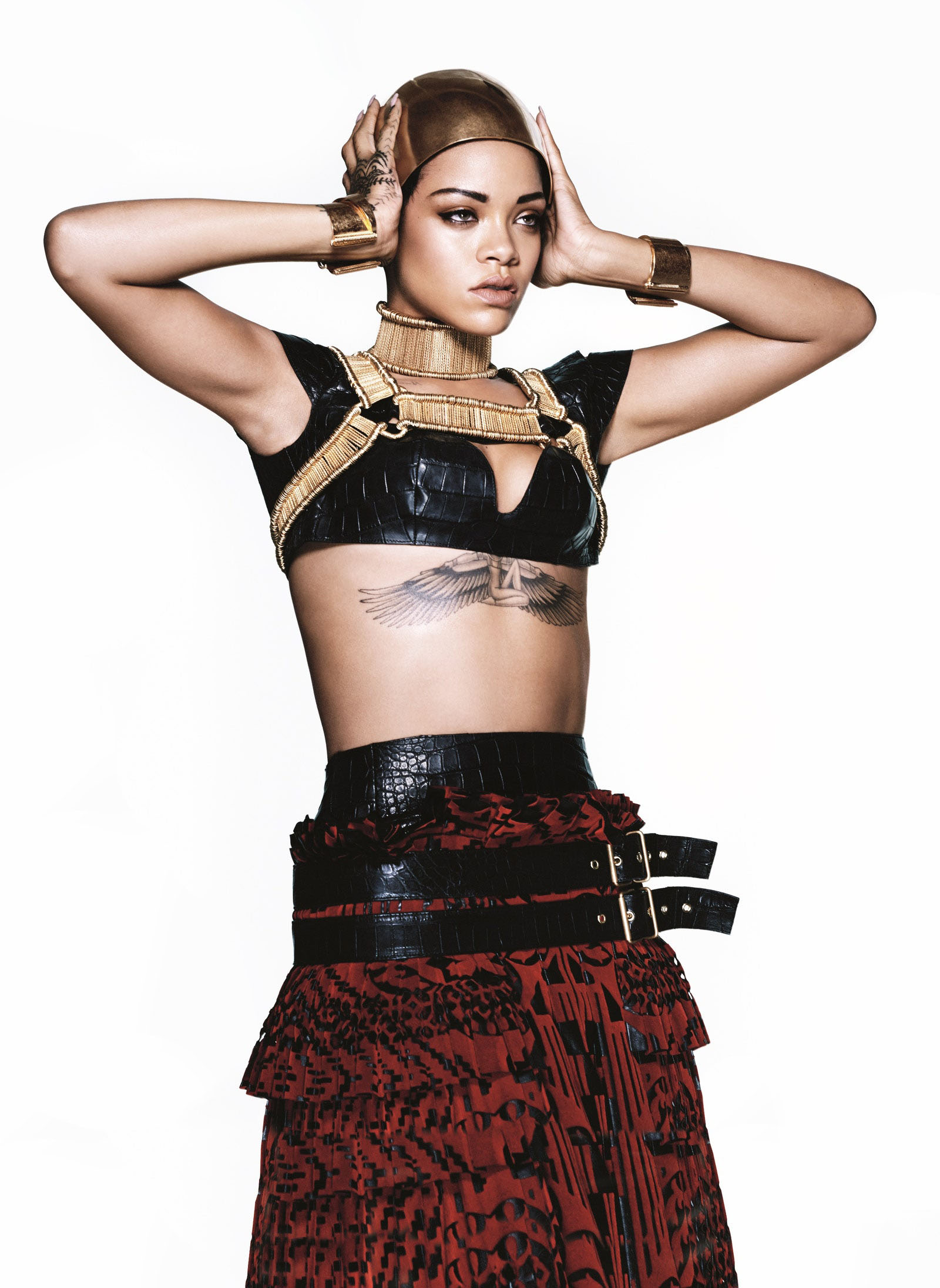 Rihanna in an Alexander McQueen crocodile bra top, laser-cut leather skirt, gold cloche hat, cuffs, choker, and harness Photographed by David Sims, Vogue, March 2014
