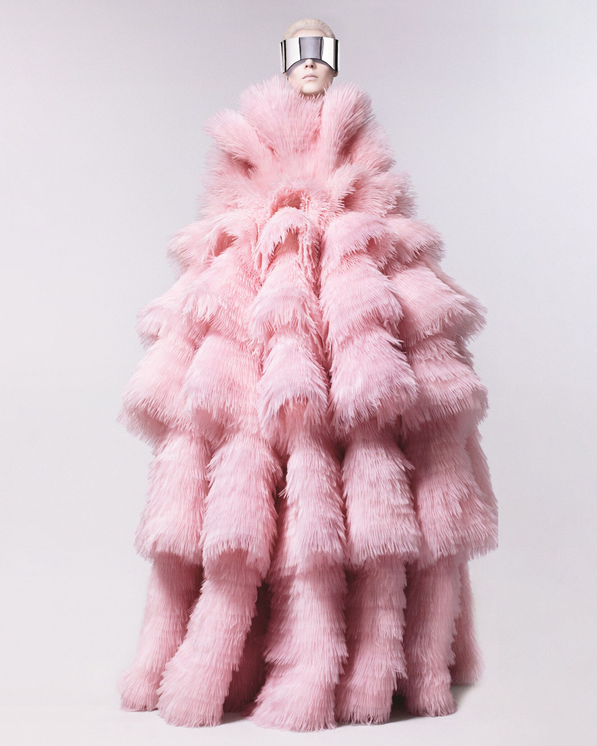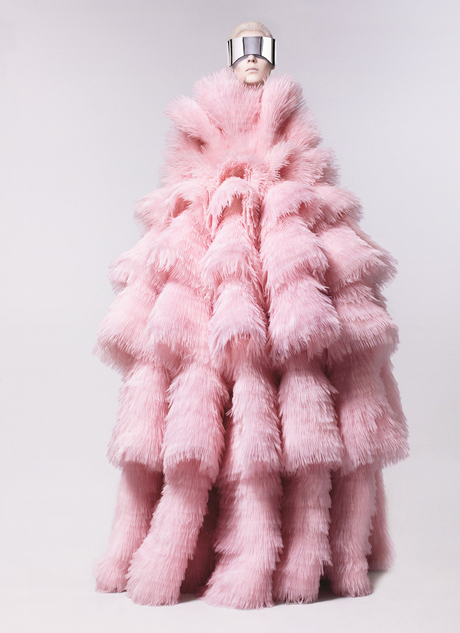 Kati Nescher wears a tiered pleated organza dress and mirrored visor by Alexander McQueen. Photographed by David Sims, Vogue, July 2012