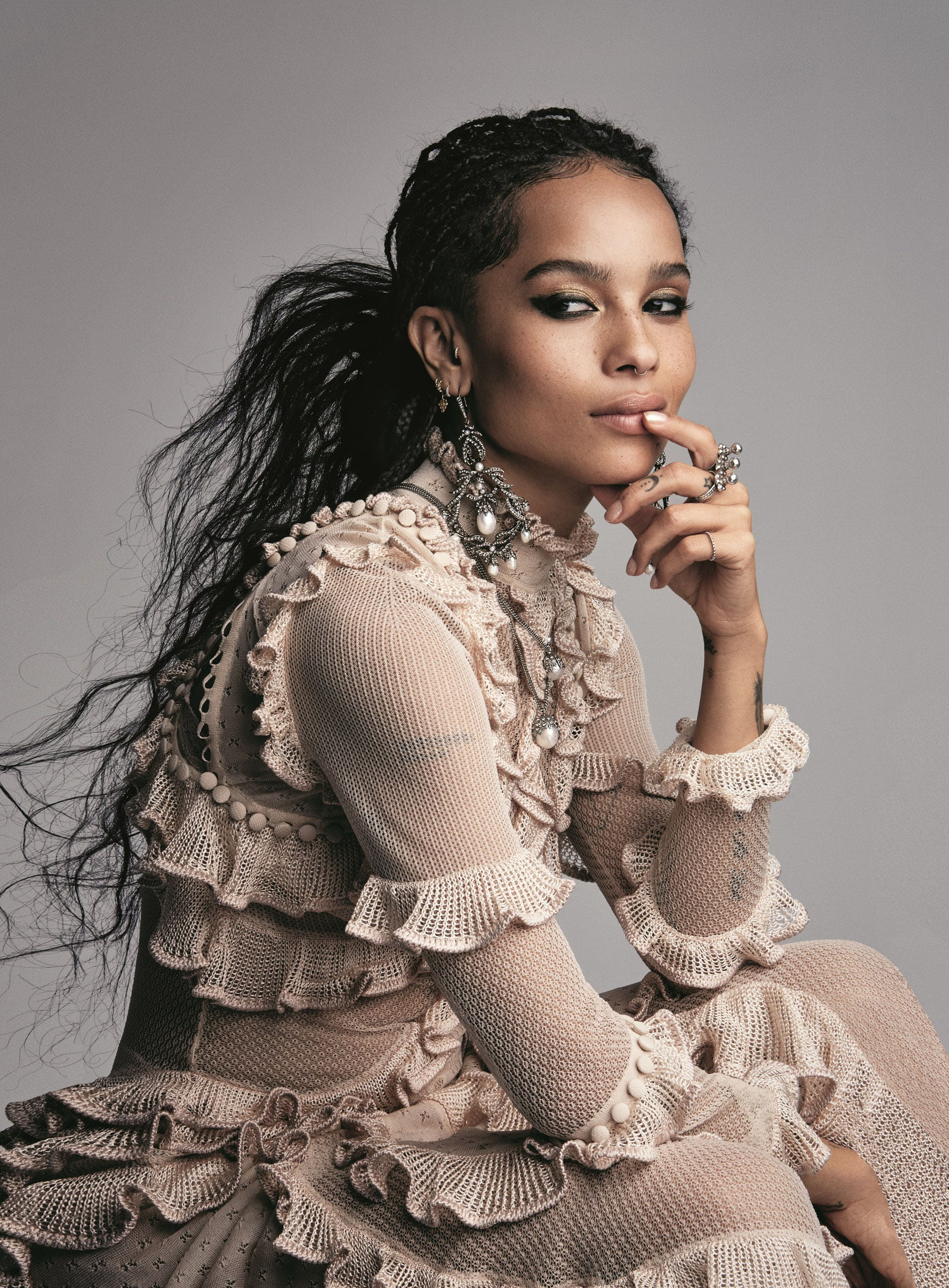 Zoë Kravitz in an Alexander McQueen dress, earrings, and necklace Photographed by Patrick Demarchelier, Vogue, May 2016