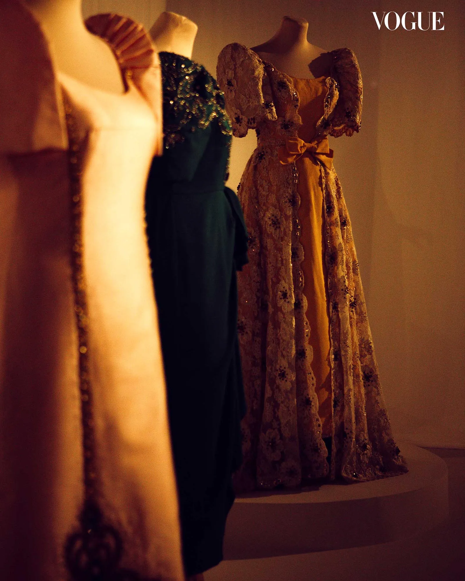 The walk through the Timeless: J. Moreno exhibit, currently still on view at The M, is demarcated by shadows. They move with you the further in you go, shifting in the soft glow of yellow light. Before fabric and technique, you are met with impressions: of butterfly sleeves extending from shoulders, of the openwork of intricate calado, of the length of a train.