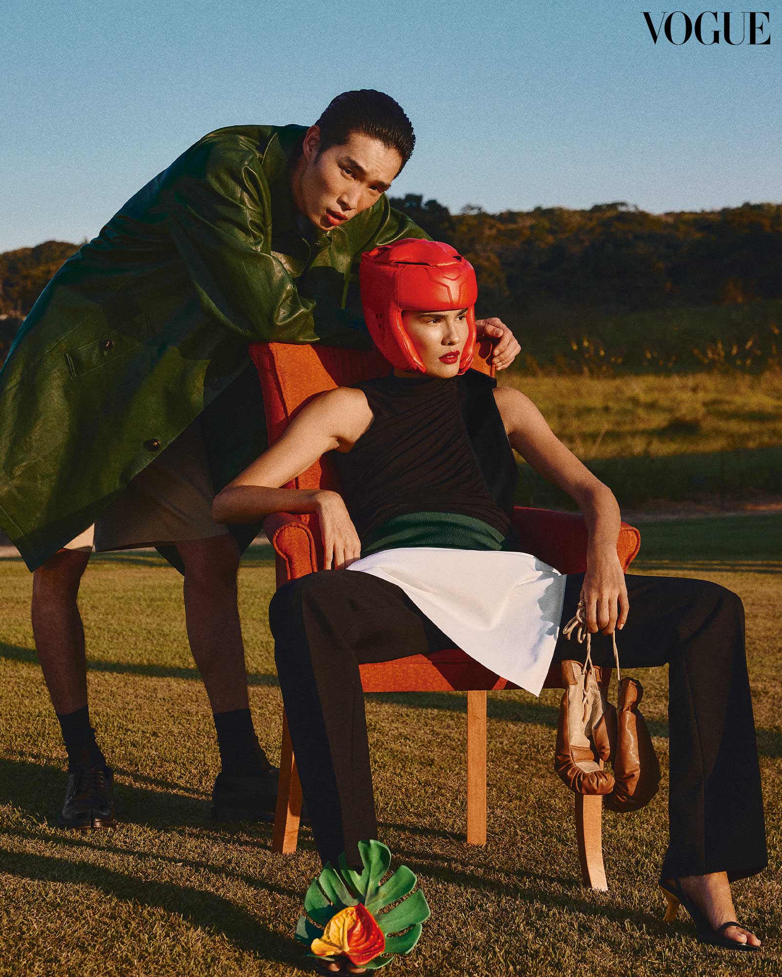 From left: Elia wears a FERRAGAMO sweater, trench coat, and shorts, MAISON MARGIELA socks and shoes. Yani wears a vintage boxing head guard from MINHA AVÓ TINHA, FERRAGAMO top, skirt, and trousers, and LOEWE heels. Photographed by Jonathan Zamora and styled by Alexandre Dornellas for the July 2024 Issue of Vogue Philippines.