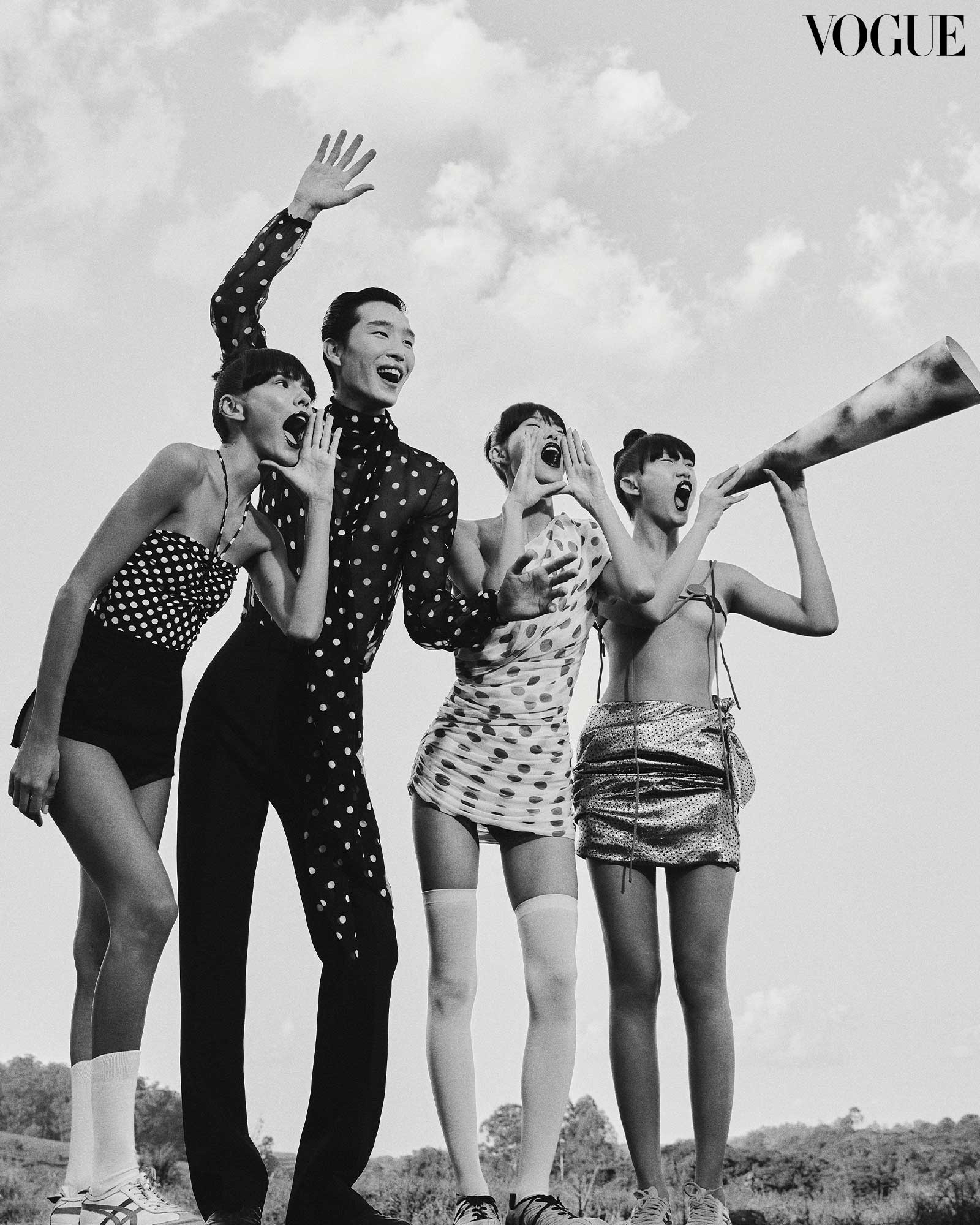 From left: Yani wears a SAINT LAURENT bodysuit and skirt, and CALZEDONIA socks. Elia wears a SAINT LAURENT top and trousers, and vintage sneakers from MINHA AVÓ TINHA. Fernanda wears a SAINT LAURENT dress and vintage sneakers from MINHA AVÓ TINHA. Lulu wears an ADRIANA DEGREAS bra and SAINT LAURENT skirt. Photographed by Jonathan Zamora and styled by Alexandre Dornellas for the July 2024 Issue of Vogue Philippines.