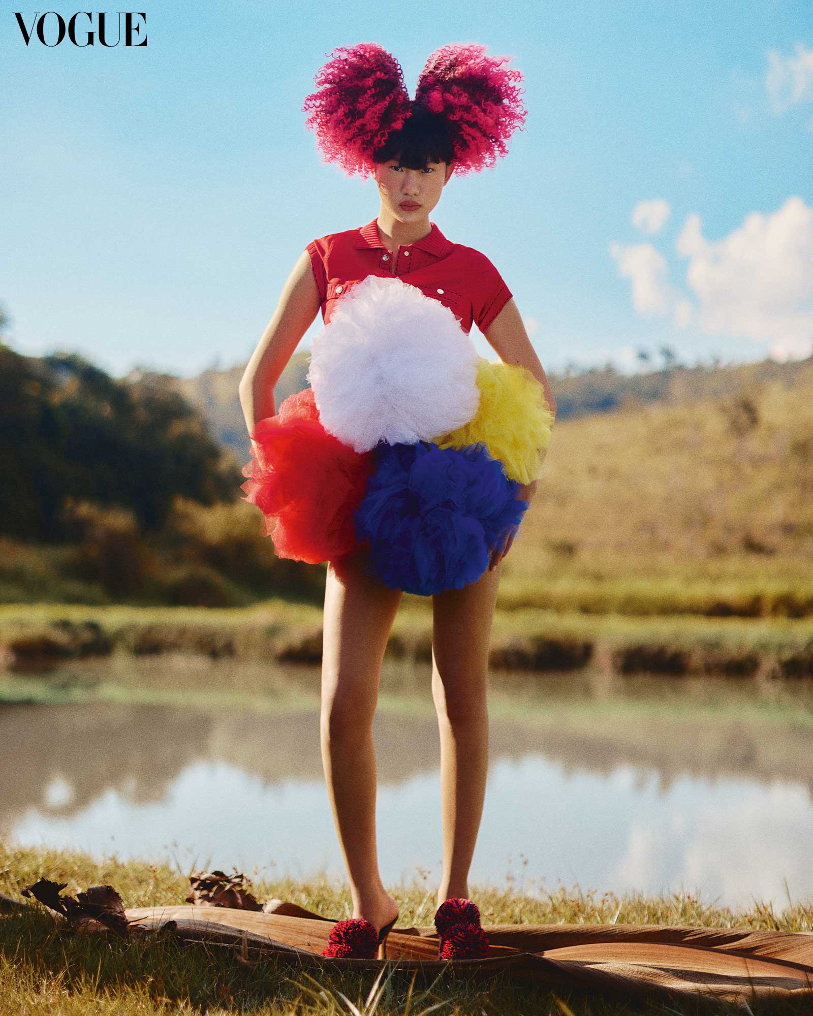 CAROLINA HERRERA polo shirt, PENHA MAIA dress, and BOTTEGA VENETA heels. Photographed by Jonathan Zamora and styled by Alexandre Dornellas for the July 2024 Issue of Vogue Philippines.