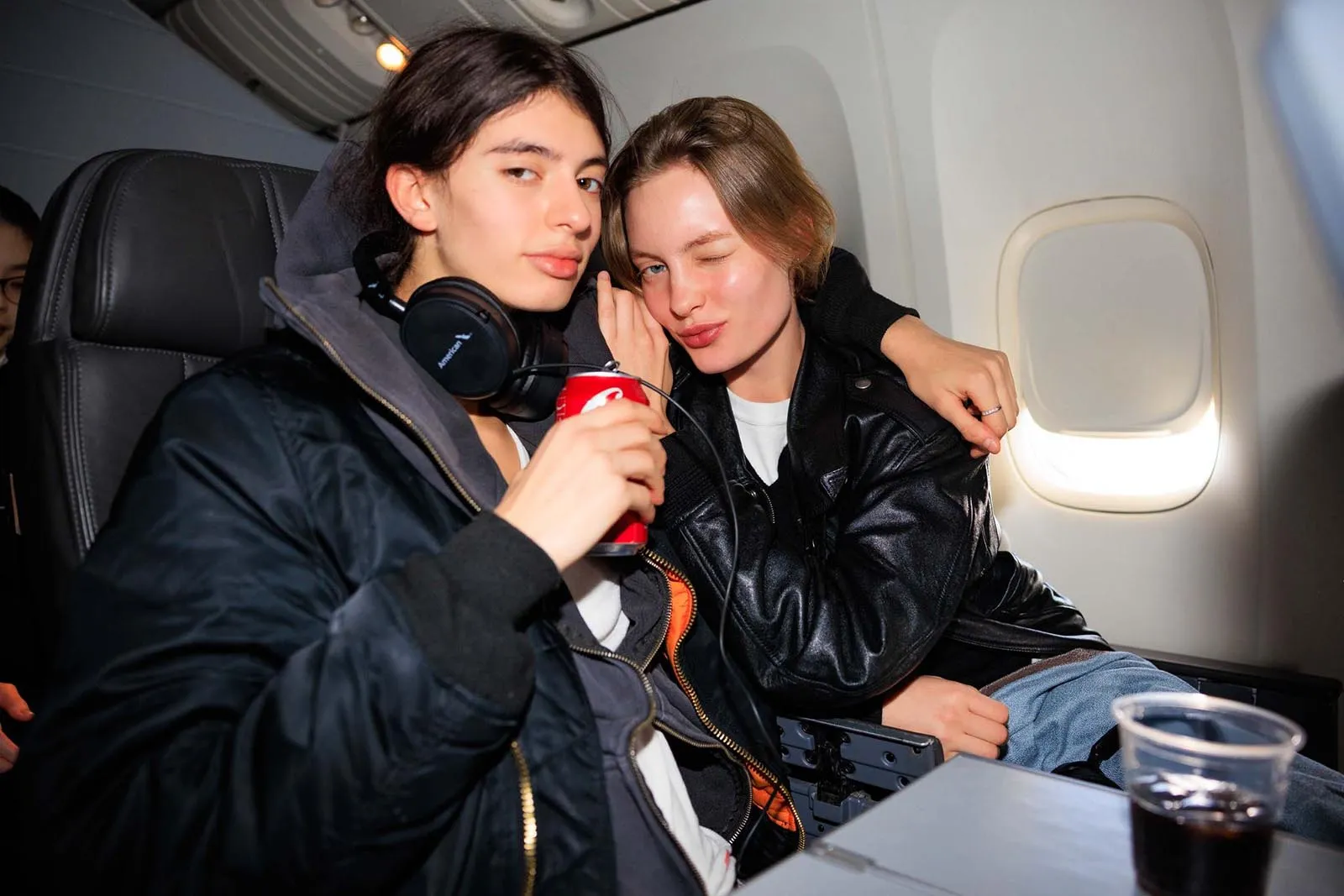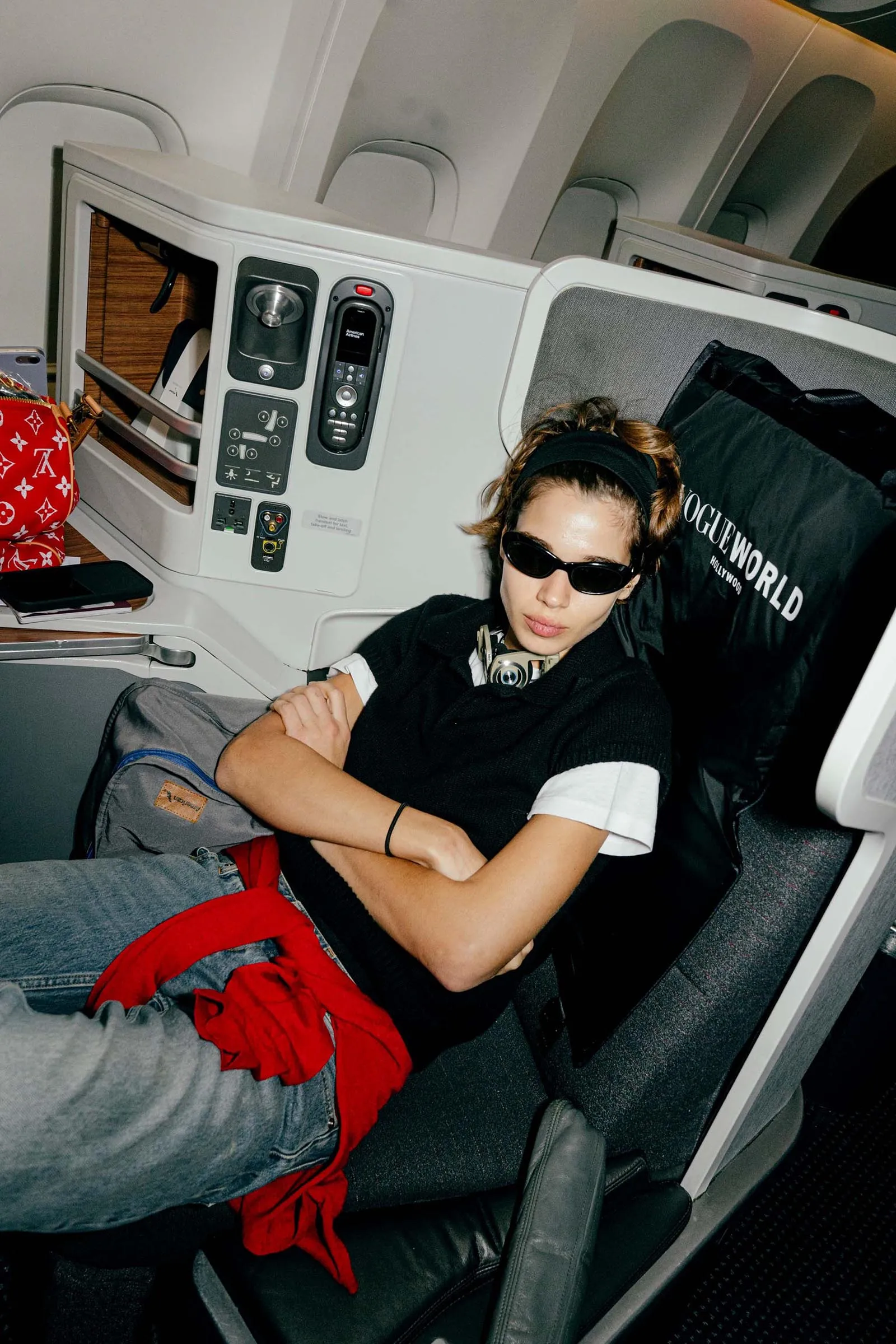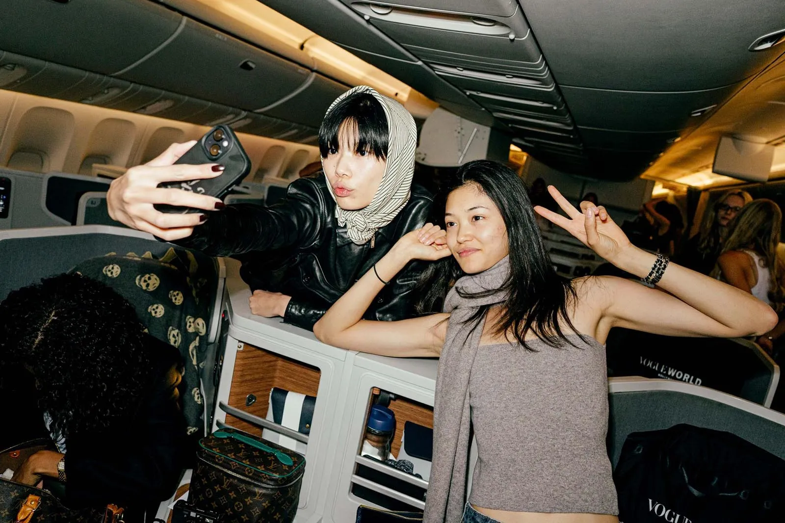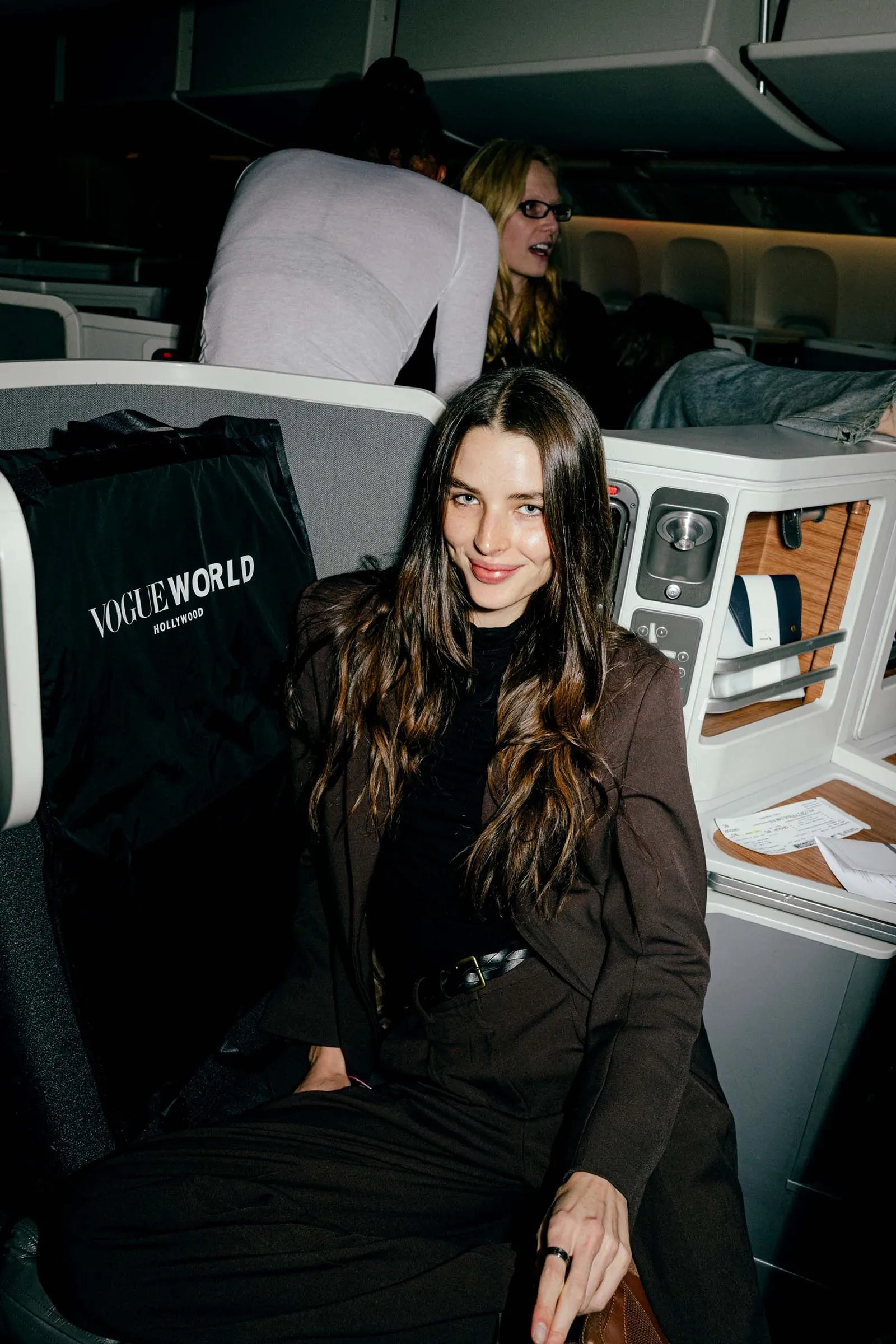 Vogue’s global design director, Parker Hubbard, wakes us up: the time has come to get Acielle up to photograph the girls. (This wouldn’t be Vogue Air without a little content!) Everyone is happy to have their photograph taken, with models Nora Attal and Ugbad Abdi saying that this is just like their plane from Milan to Paris during fashion week, except better because it’s solely Vogue people. (Also, here on Vogue Air, everyone is treated like they’re flying first-class, down to the decadent breakfast menu and free Vogue World: Hollywood goodies, including a garment bag and custom Vogue x American Air amenity kit.)