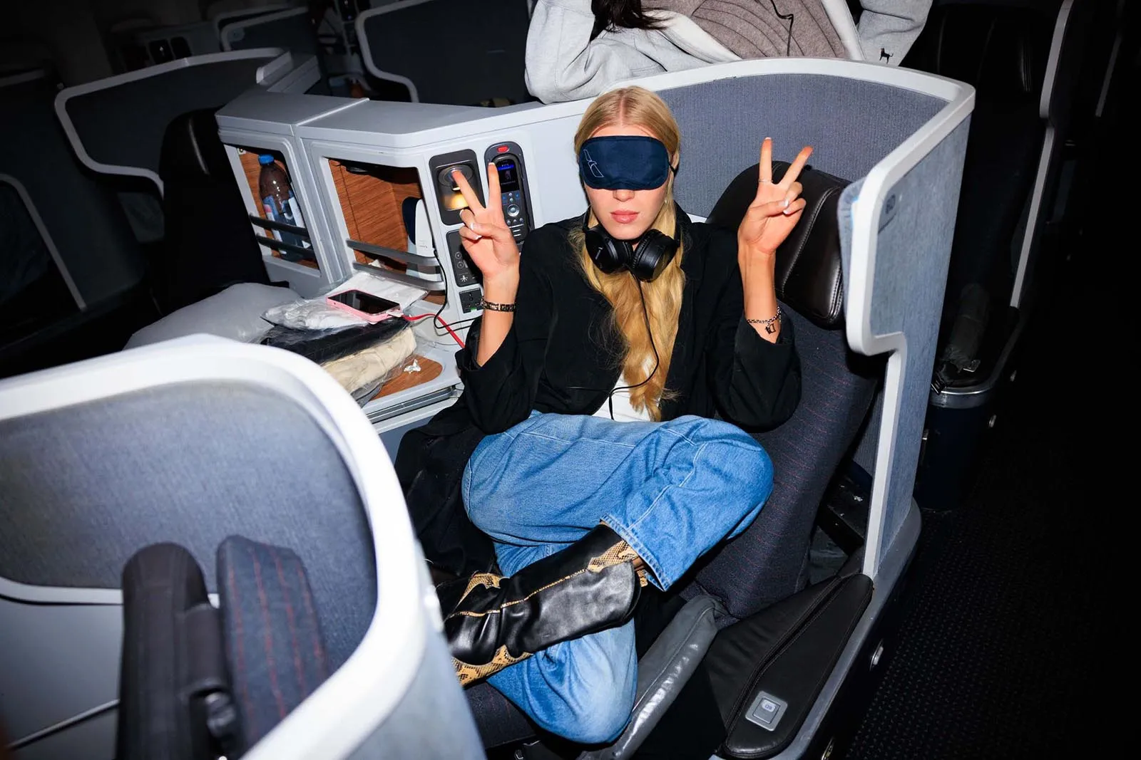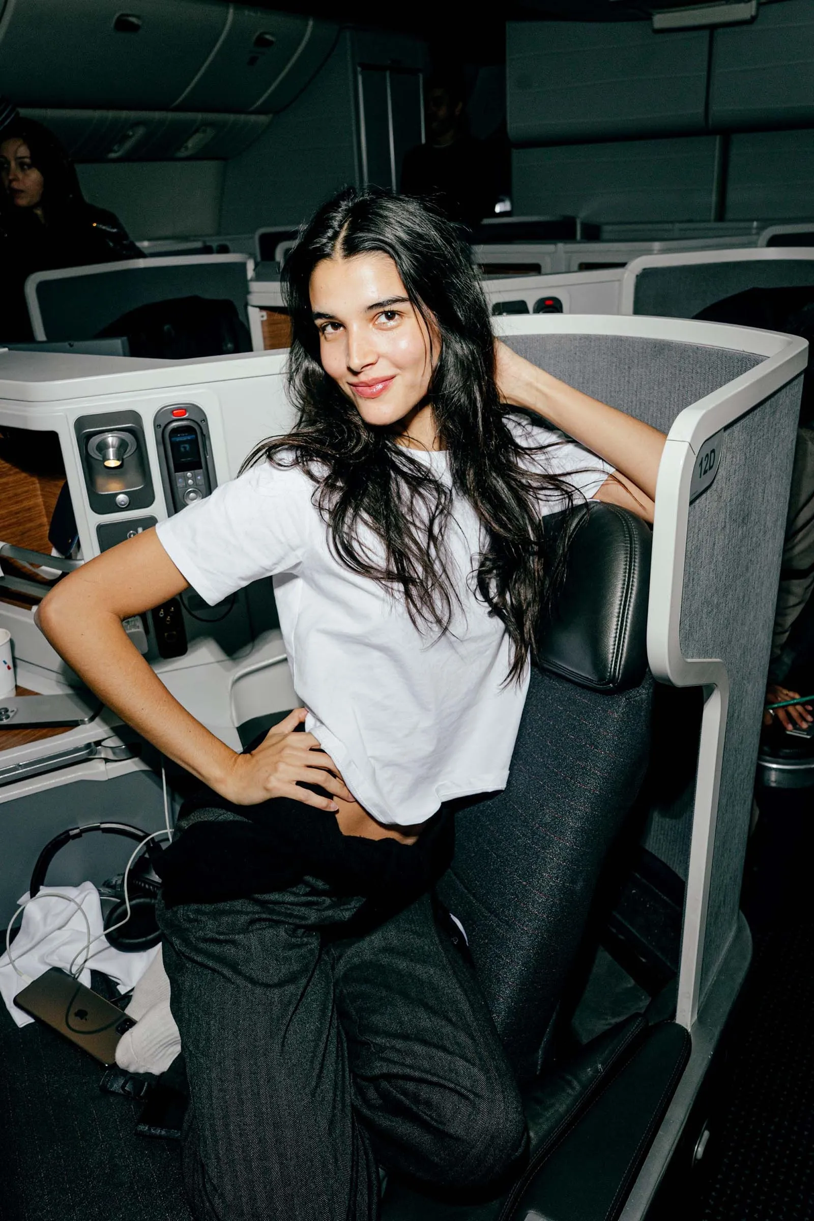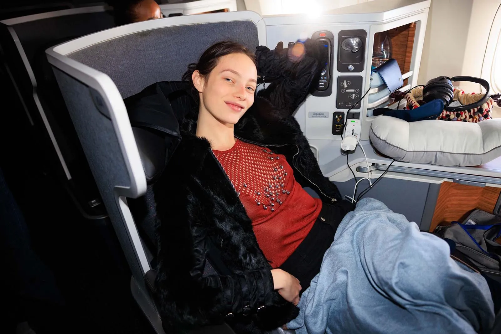 Vogue’s global design director, Parker Hubbard, wakes us up: the time has come to get Acielle up to photograph the girls. (This wouldn’t be Vogue Air without a little content!) Everyone is happy to have their photograph taken, with models Nora Attal and Ugbad Abdi saying that this is just like their plane from Milan to Paris during fashion week, except better because it’s solely Vogue people. (Also, here on Vogue Air, everyone is treated like they’re flying first-class, down to the decadent breakfast menu and free Vogue World: Hollywood goodies, including a garment bag and custom Vogue x American Air amenity kit.)