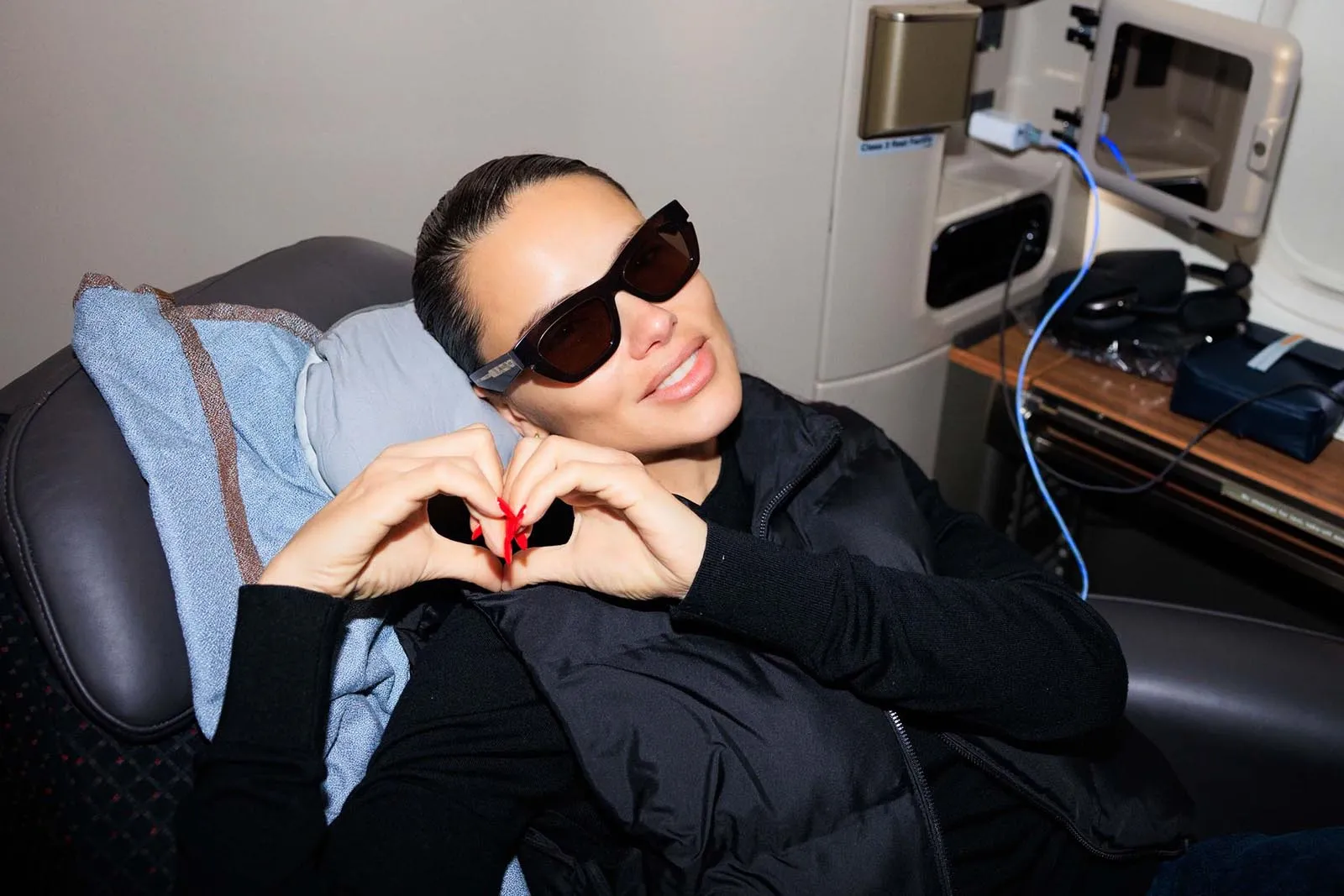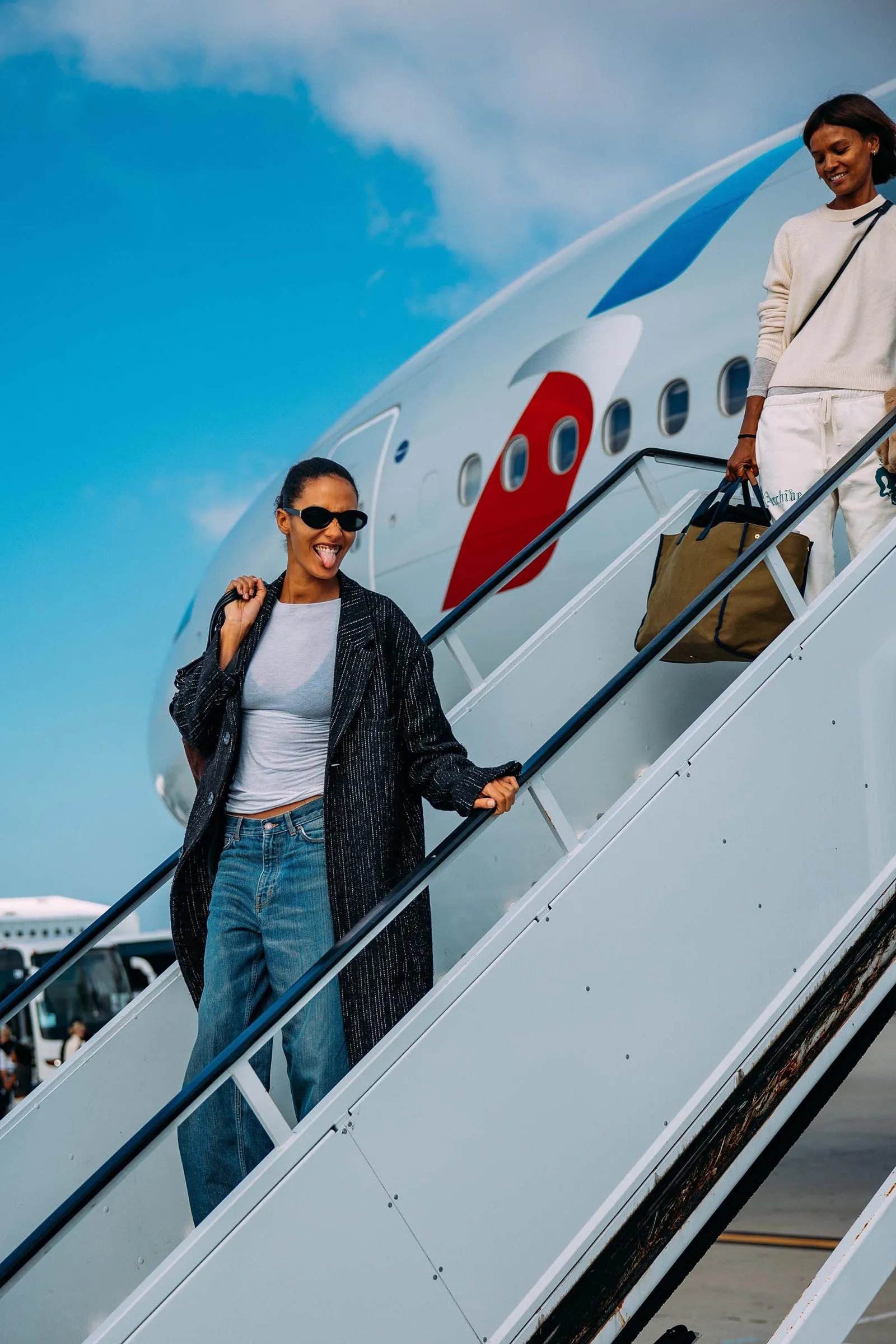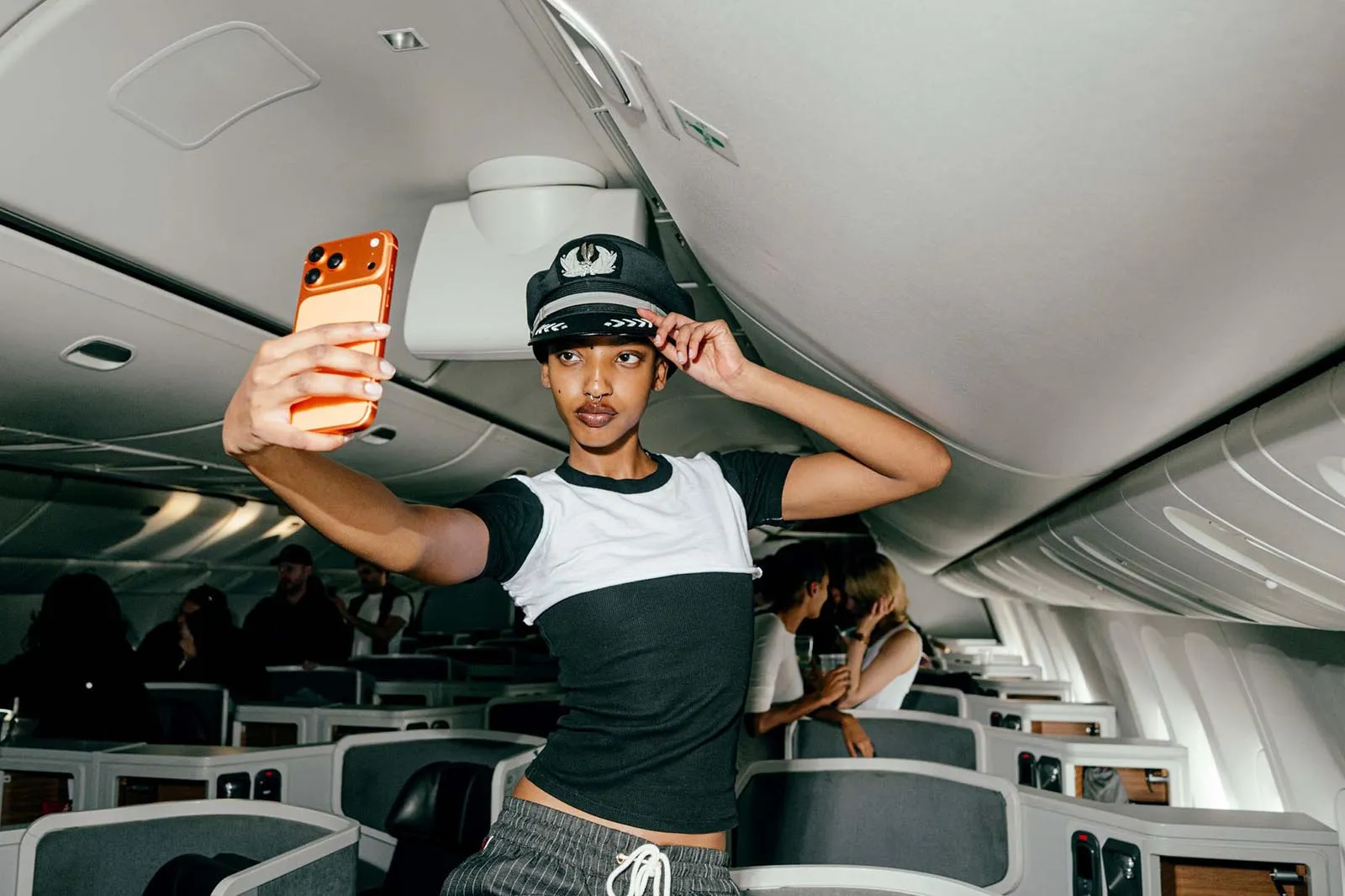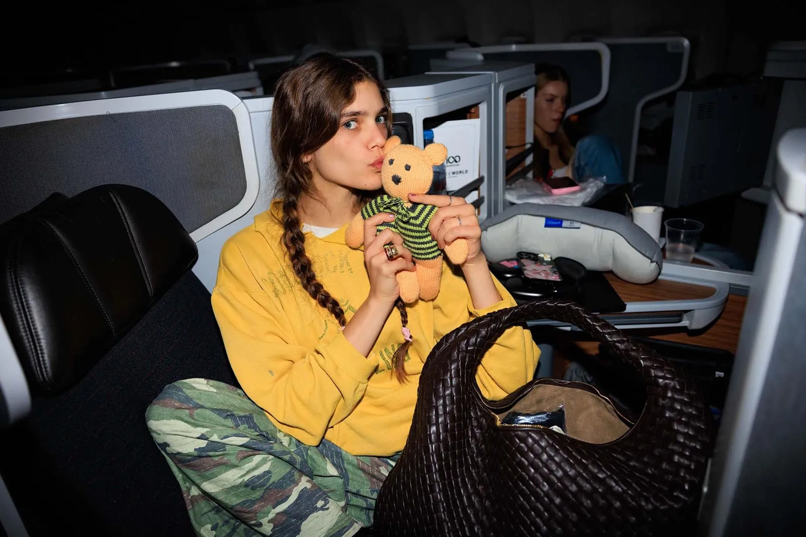 Vogue’s global design director, Parker Hubbard, wakes us up: the time has come to get Acielle up to photograph the girls. (This wouldn’t be Vogue Air without a little content!) Everyone is happy to have their photograph taken, with models Nora Attal and Ugbad Abdi saying that this is just like their plane from Milan to Paris during fashion week, except better because it’s solely Vogue people. (Also, here on Vogue Air, everyone is treated like they’re flying first-class, down to the decadent breakfast menu and free Vogue World: Hollywood goodies, including a garment bag and custom Vogue x American Air amenity kit.)