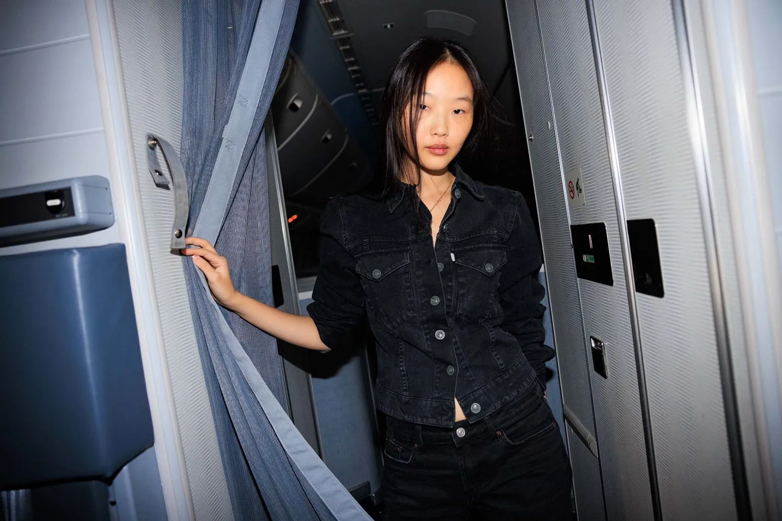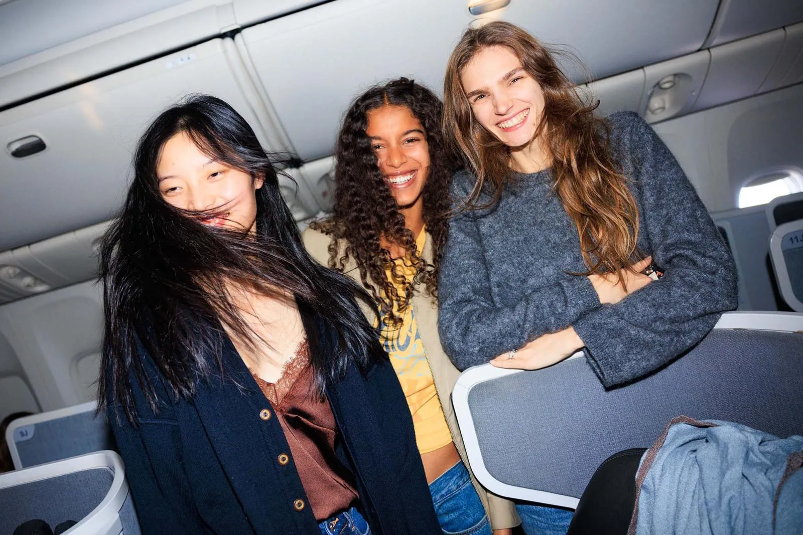 We start to photograph the girls, and everyone gets into it. They practice their walks and poses in the plane’s aisles and even try their hand at working as flight attendants, passing around snacks and water. (The rest of the Vogue staff chuckle at the back of the plane as all this unfolds.)