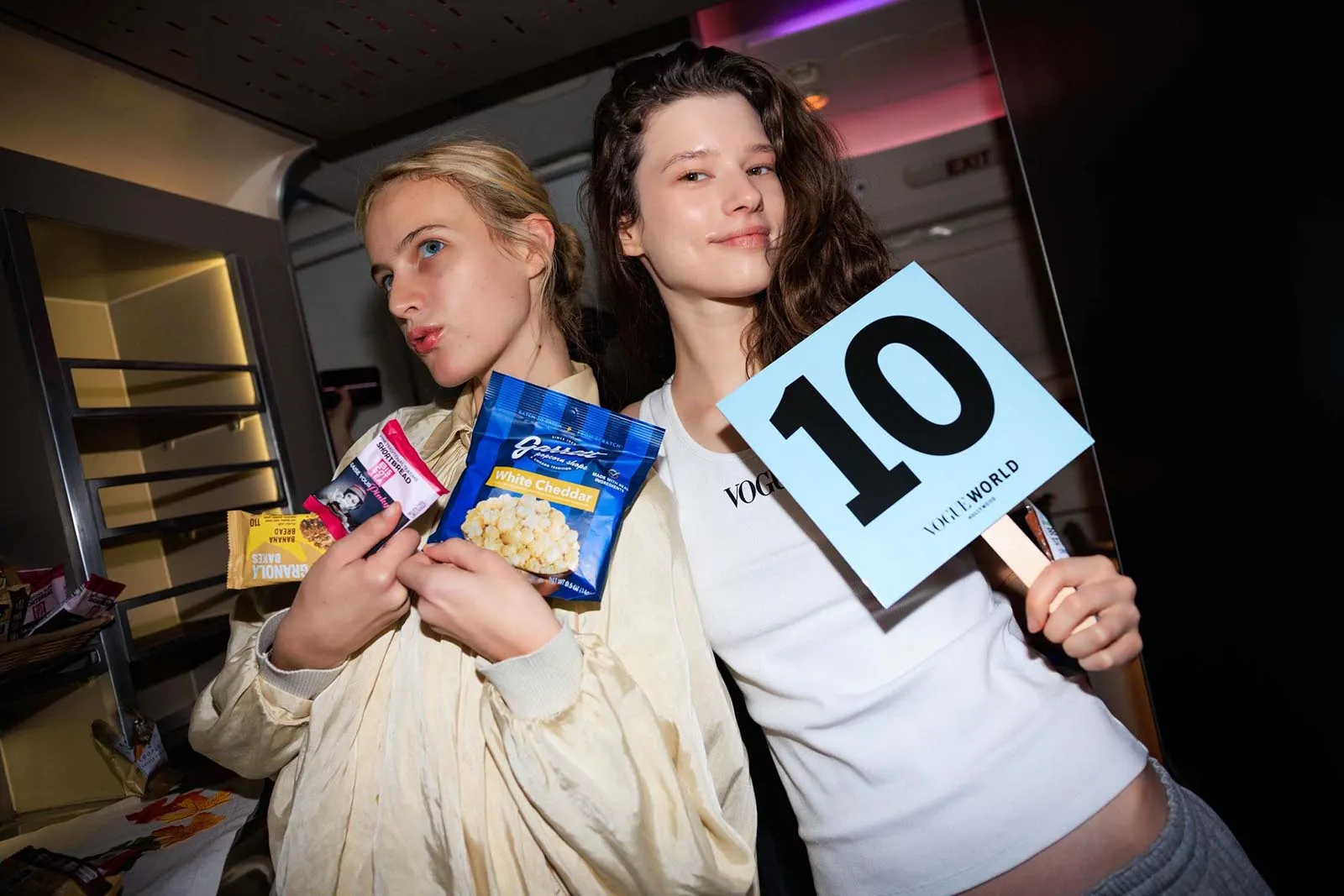Any Vogue staff who attempted to get some shut-eye before landing are now awake, roused by the screams and cheers of the models. At the same time, some of those models come around with snacks. Entertainment and top-notch service? Who could ask for more?
