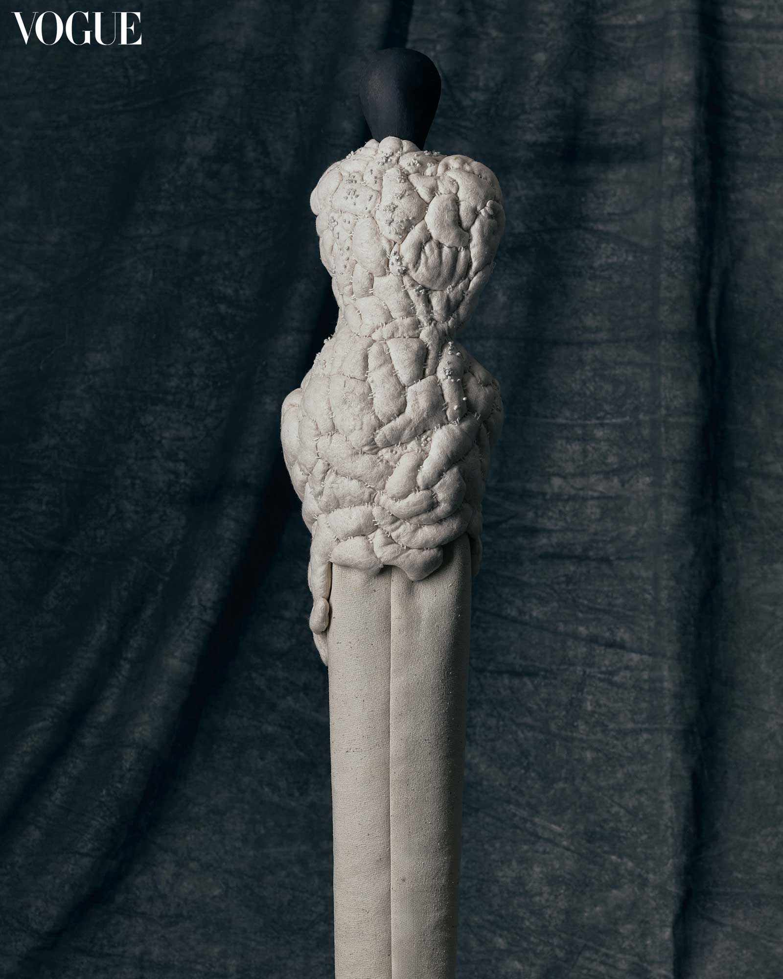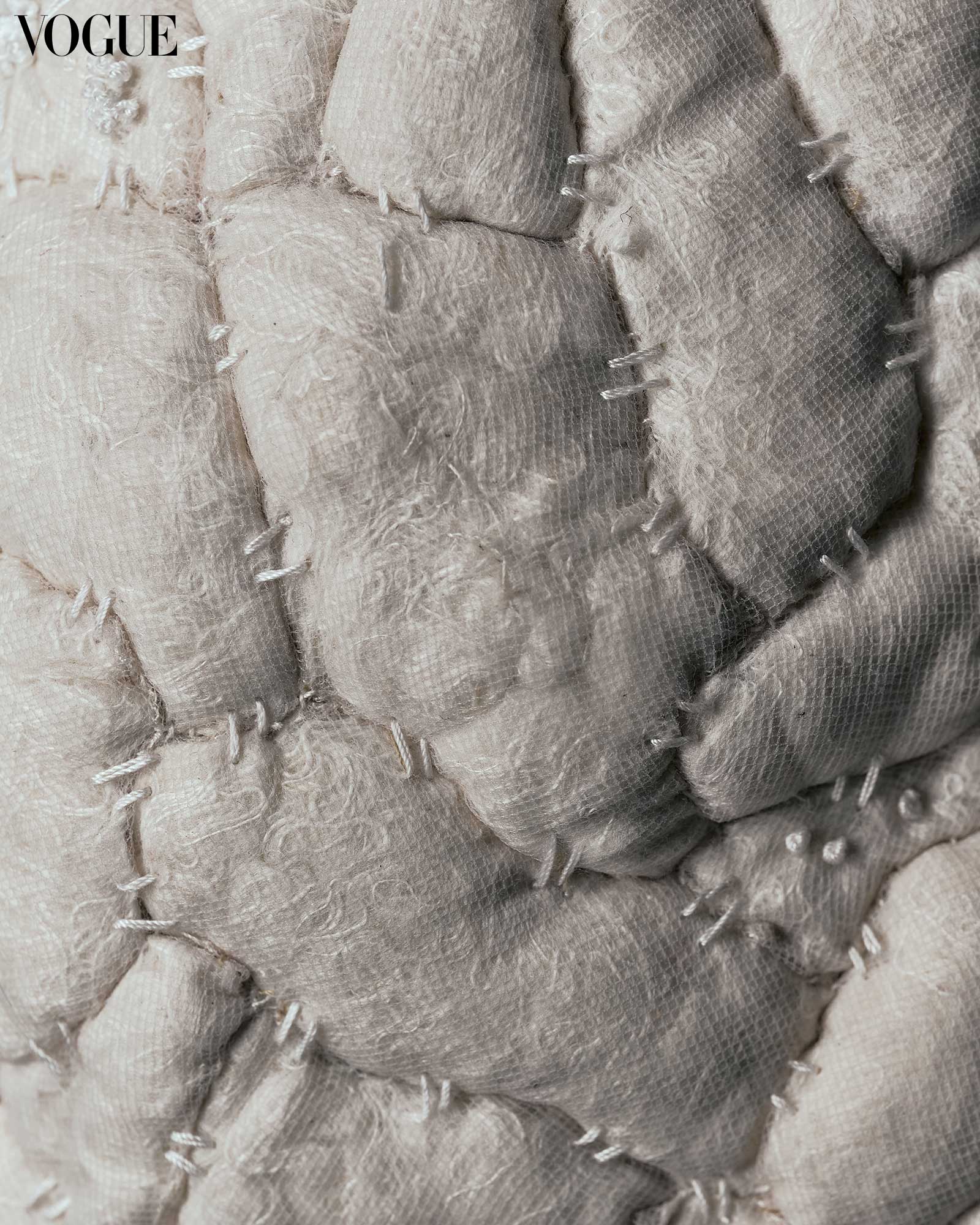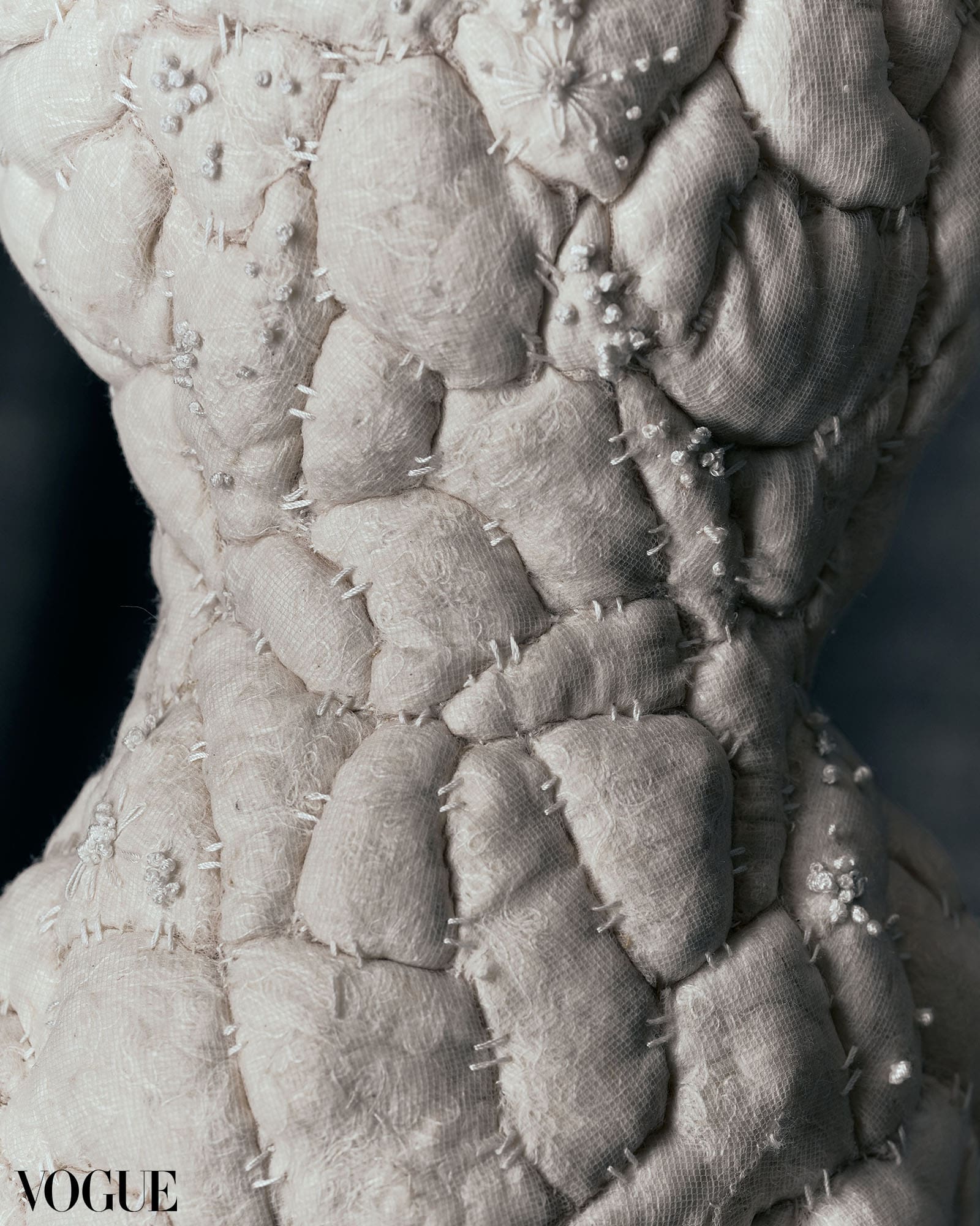 For his contribution to Vogue Threads, Nadales features a piece made out of cotton staple, mercerized thread, and silk noil. The integration of French knots and basting stitches play a crucial role in this design, which the designer alludes to “the idea of reaching one’s destination.” Further explaining the techniques seen in the work, Nadales says that the intricate French knots mirror milestones and achievements, while the basting stitches reflect moments of uncertainty or transition along the way.