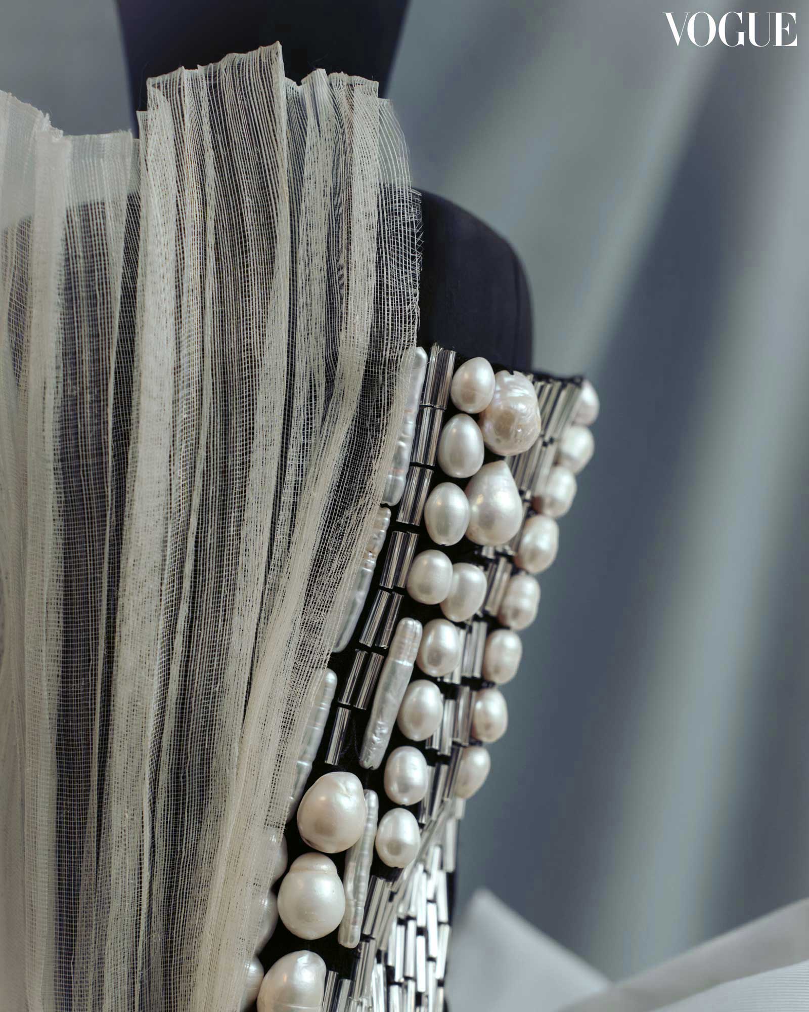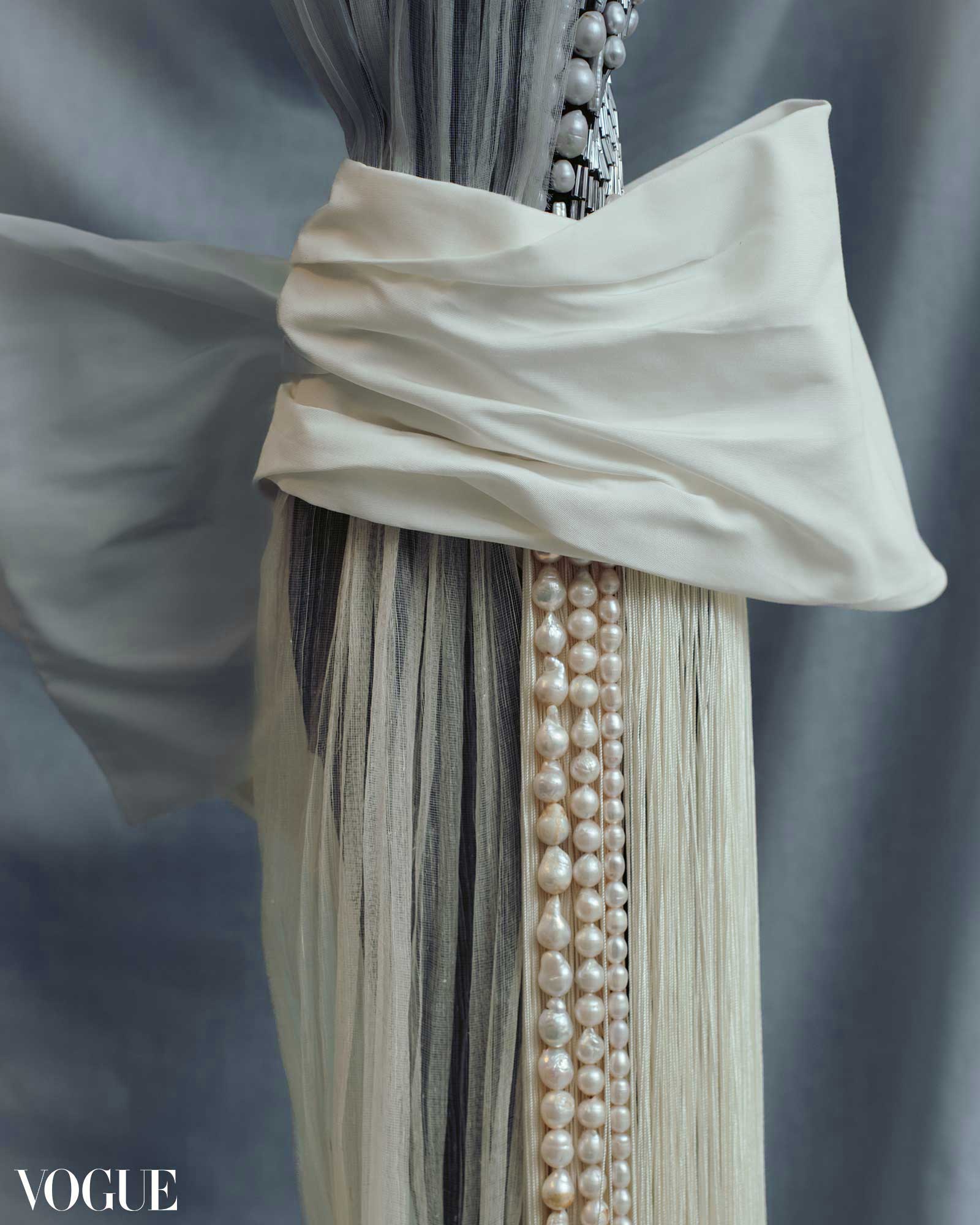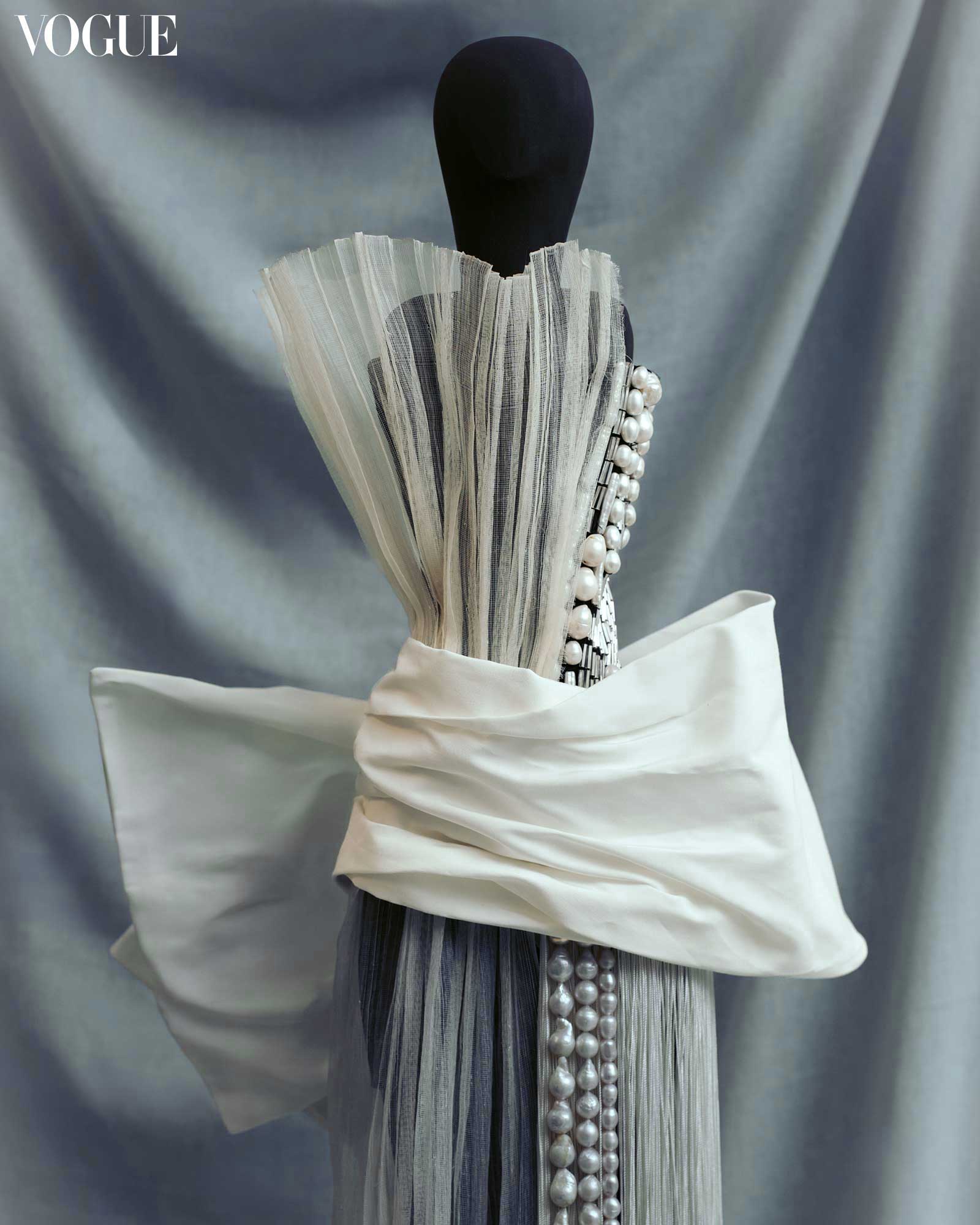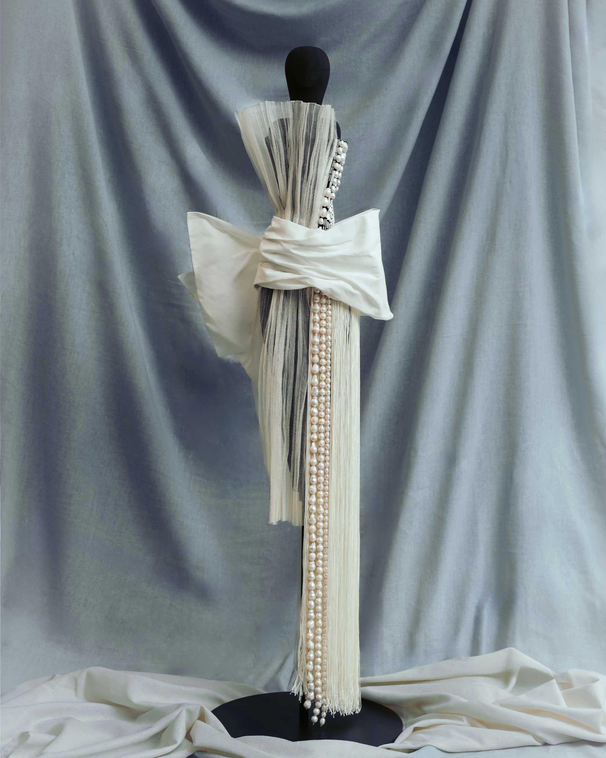 Trailing crystal beads, pearls, and fringe get a subtle interruption by way of pleated piña-seda and molten cotton faille. “By assembling different textiles, shape and form harken to the past but also orientate towards the future.”