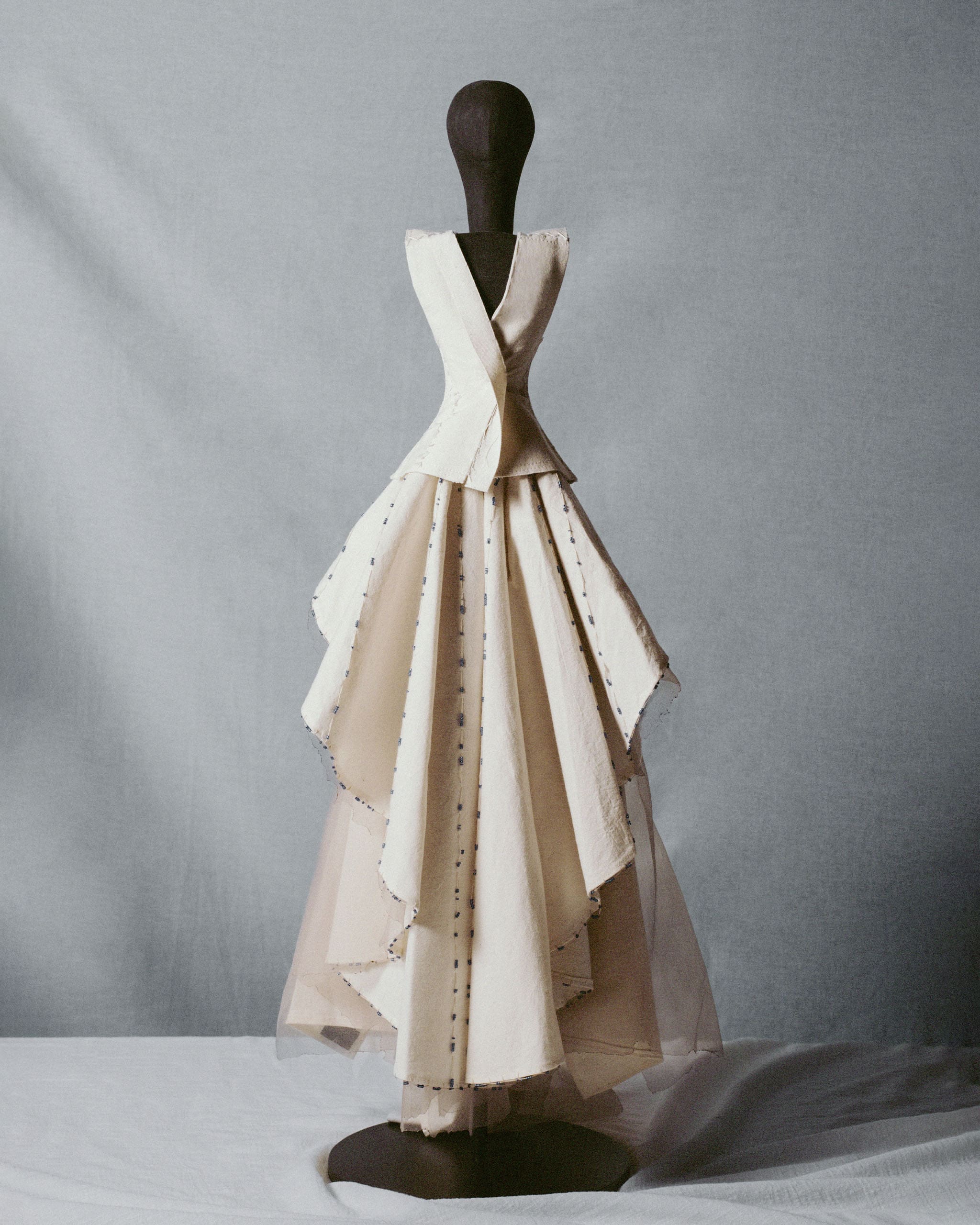 Bagasao’s design process reflects his commitment to ethical practices in fashion. “Our brand wants to create beauty with the intent of making things that can last a long time,” the designer says. The use of readily available materials such as muslin speaks to this philosophy of responsible design, ensuring that each piece resonates with emotion and intention, with the designer noting that over 100 minutes of handiwork were devoted to this creation.