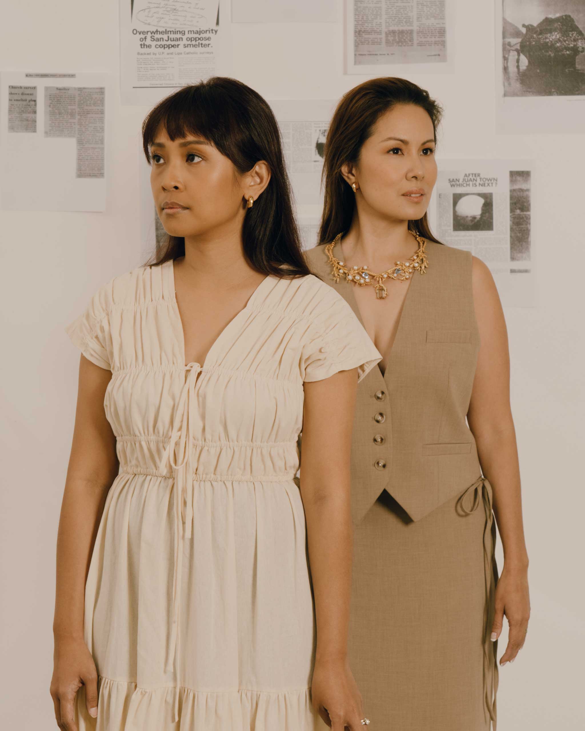 Ciara Serumgard wears Urban Revivo vest and skirt set; Atelier 818 necklace; Suki earrings; Aldo heels. Farrah Rodriguez wears Vania Romoff dress; Suki earrings; Charles & Keith heels. Photo by Kim Santos, styled by MJ Benitez, hair by Patty Inojales, makeup by Apple Fara-on
