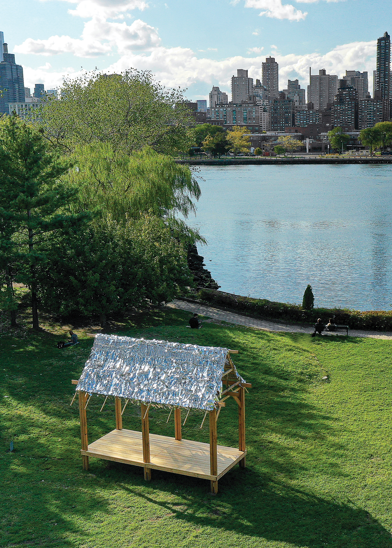 In keeping with the ethos of her RECLAIM collection, Concepcion mounted her recent installation “Disappearing St. Malo” in Socrates Sculpture Park. The artist reimagined the Bahay Kubo with woven mylar roofing. The glistening artwork is an ode to the historic fishing village along the shore of Louisiana, known as the first permanent settlement of Filipinos, and potentially the first Asian-American settlement in the United States.