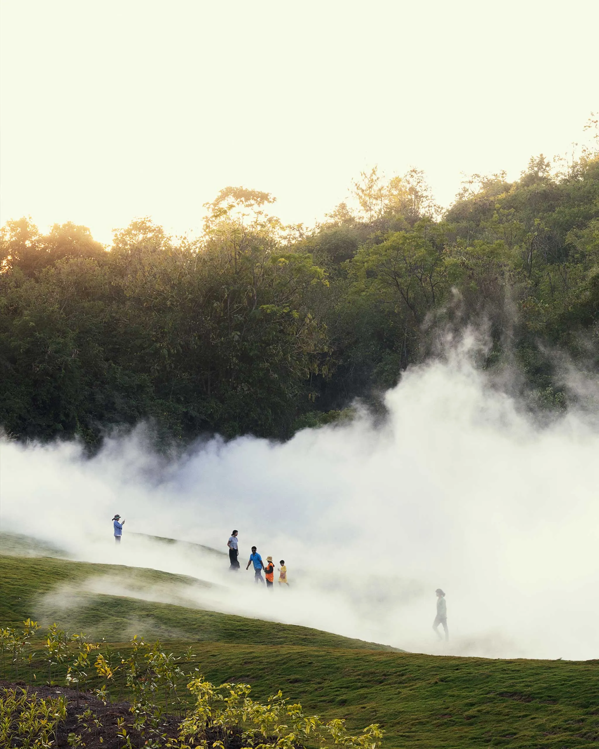 The soul of the forest, however, comes from Fujiko Nakaya, the 92-year old Japanese artist.  “Khao Yai Fog Forest, Fog Land #48435” took two years from conception to realization. At first, its location looked like nothing much: a gentle rise in the land, a clearing. Then we learned that the hills were man-made, sculpted by the artist from what was originally fields of taro. She had spent time here, sat in silence, and conceived of something deceptively simple: to turn drinking water into mist. We were led there first in the middle of the afternoon, made to remove the cumbersome wellington boots, and walk barefoot on the grass.