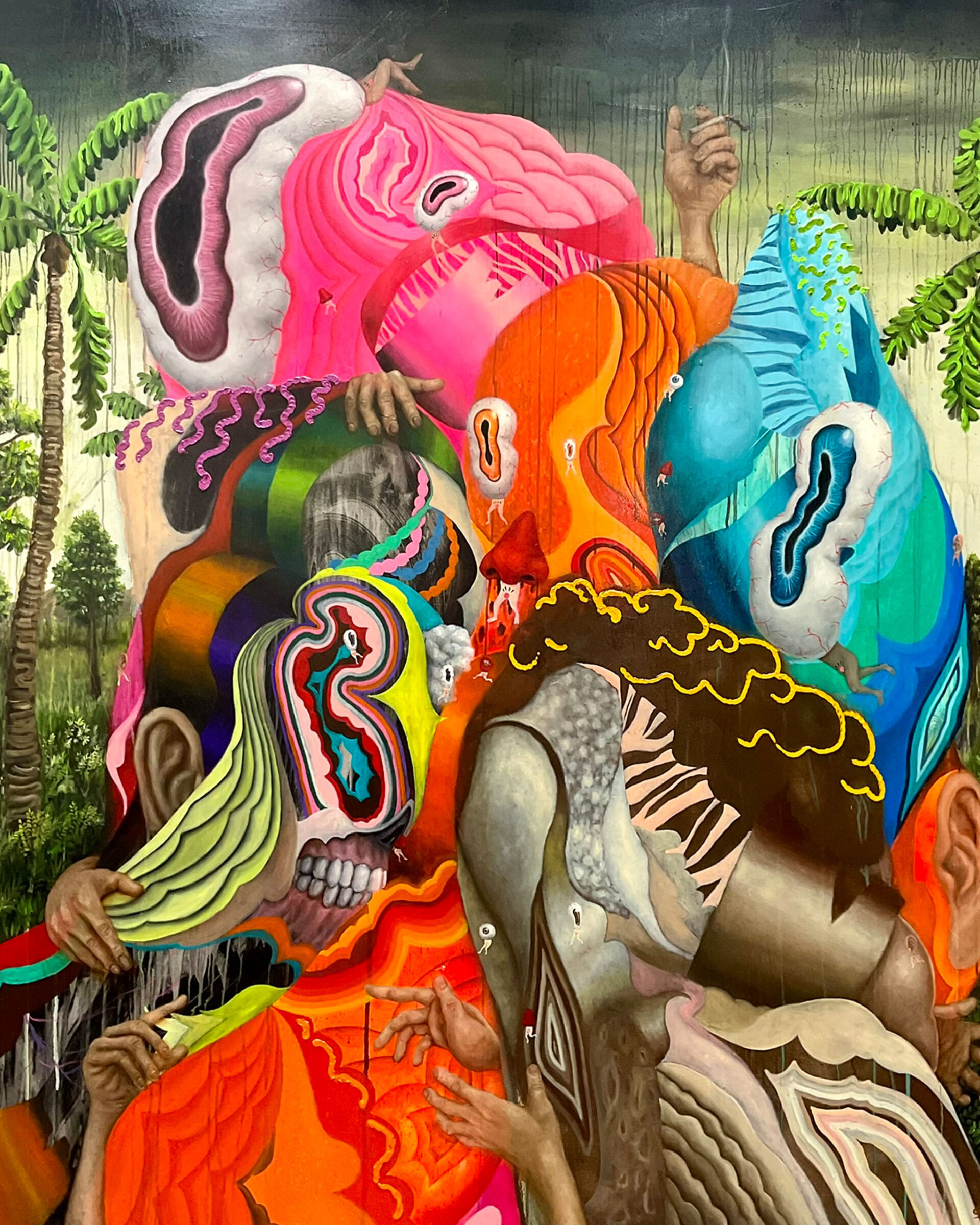 “Depending on how people will view the artwork, pwedeng they see cartoons kasi it’s one of the languages that I use that I think is very relatable to people, and then if you look at it closer, andun yung gestures, yung strokes” (it’s possible they see cartoons because it’s one of the languages that I use that I think is very relatable to people, and then if you look at it closer, you see the gestures, the strokes), he says. “I’m trying to open up conversations about painting through the paintings.”