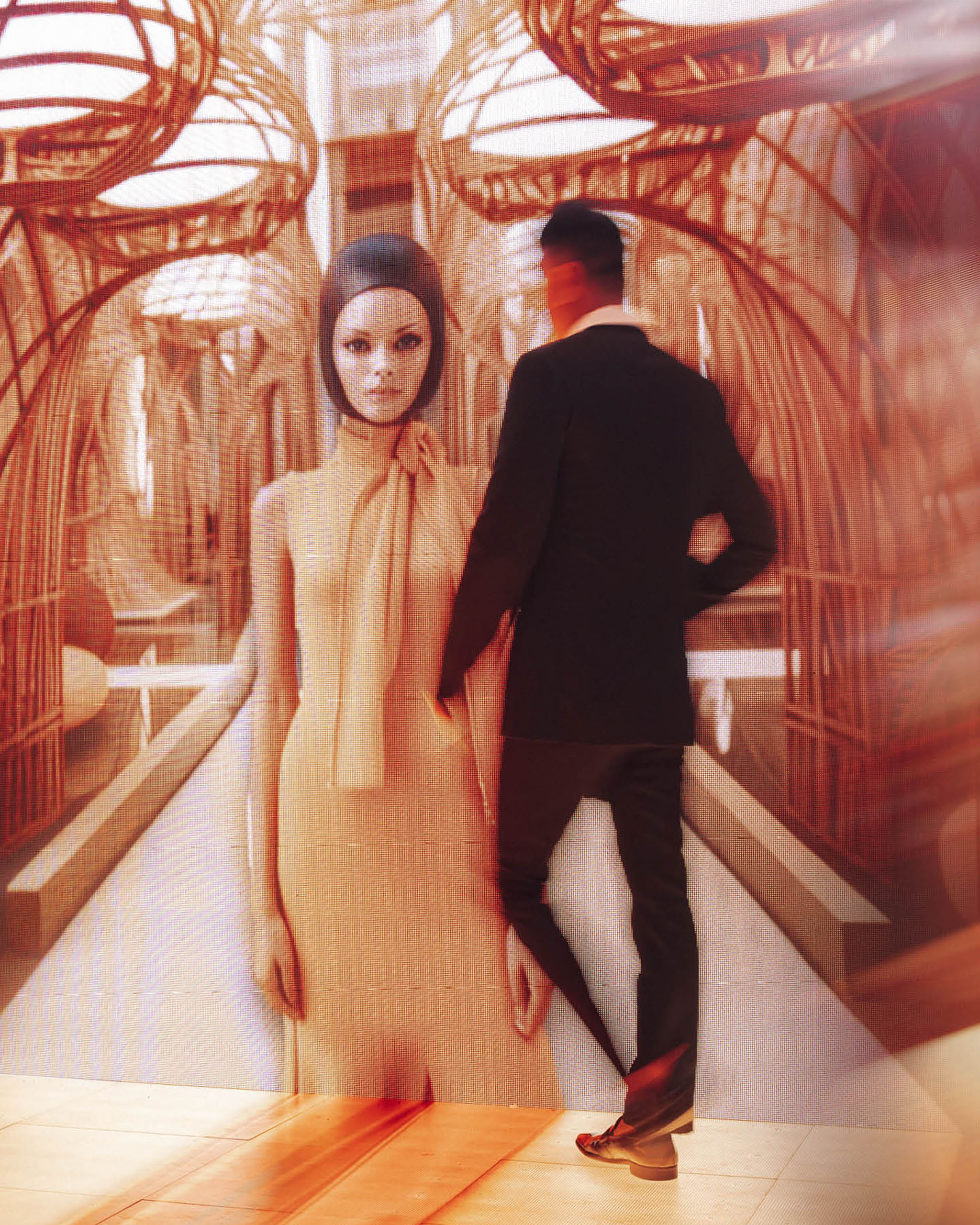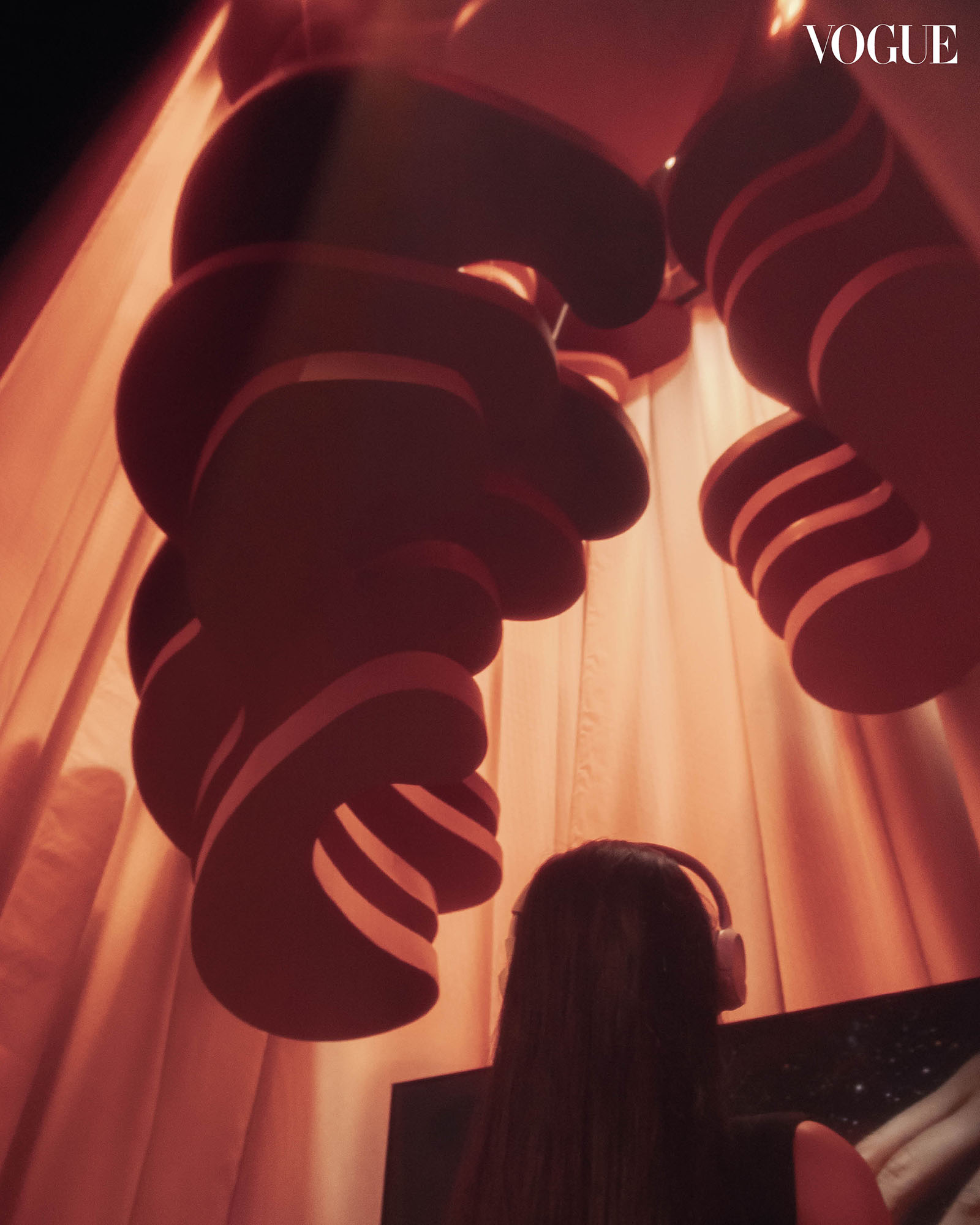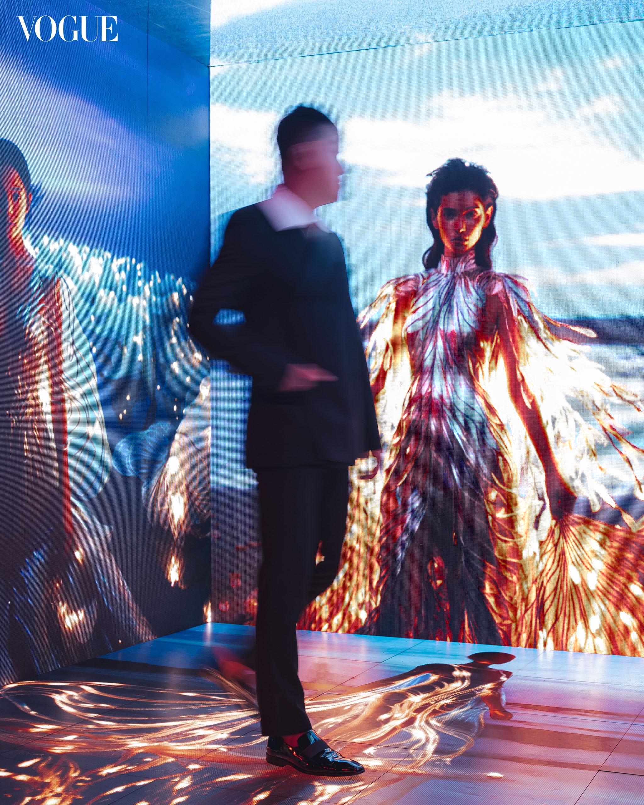 Upon entering, a cube-shaped portal transported visitors to the multiverse of Vogue 50 years from now. Creative director Vince Uy used generative software to create future fashion editorials, imagining three different scenarios, one where humans are clothed in bioluminescent life forms, one where biophilic architecture has reshaped the landscape, and one where we are armored for human survival on interplanetary terrain.