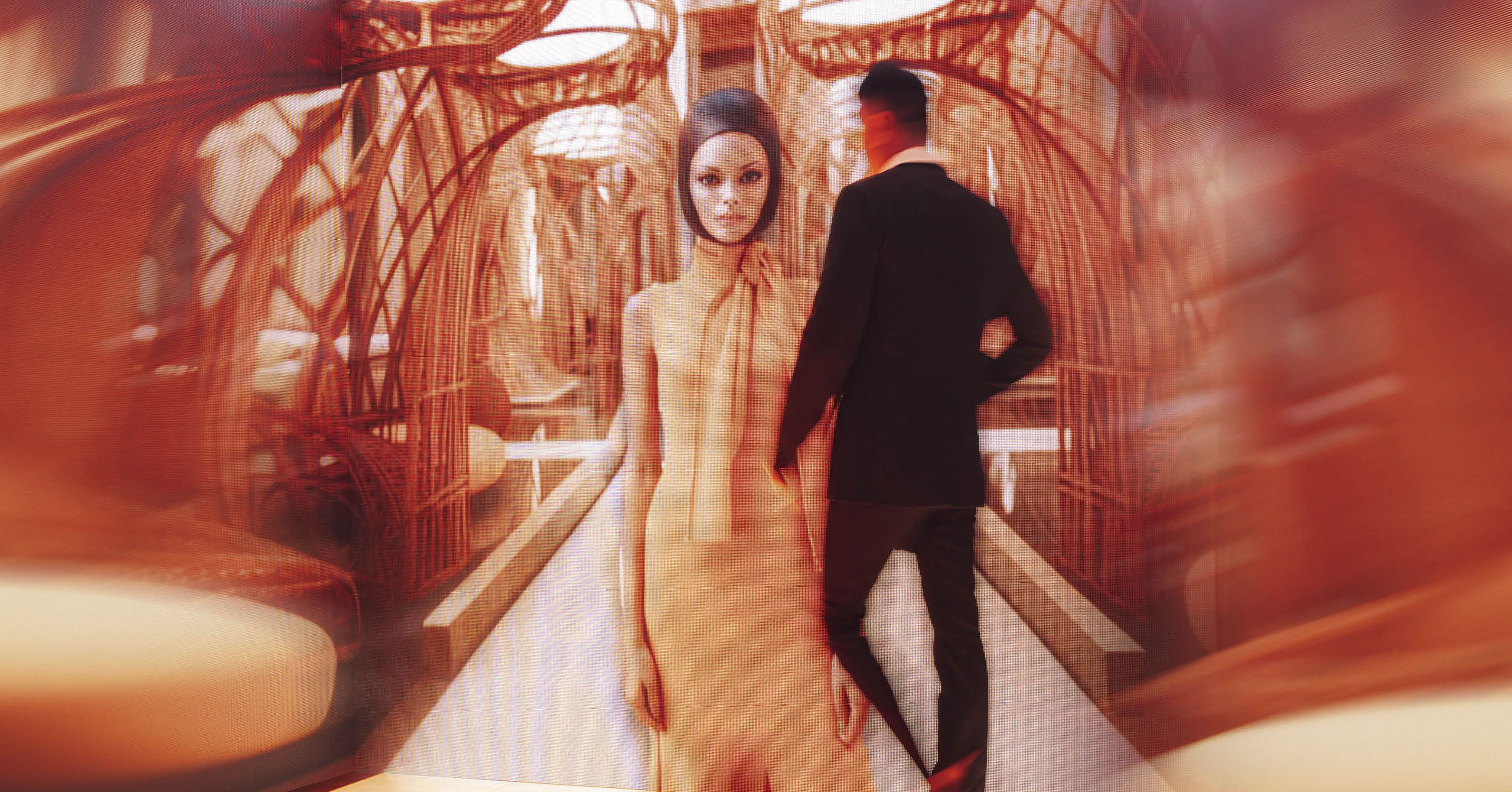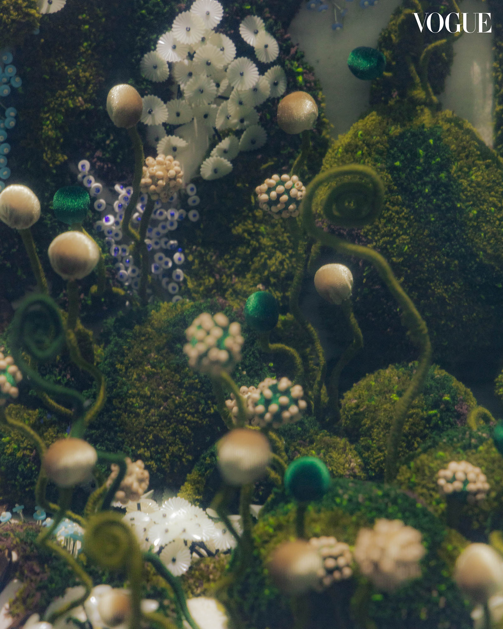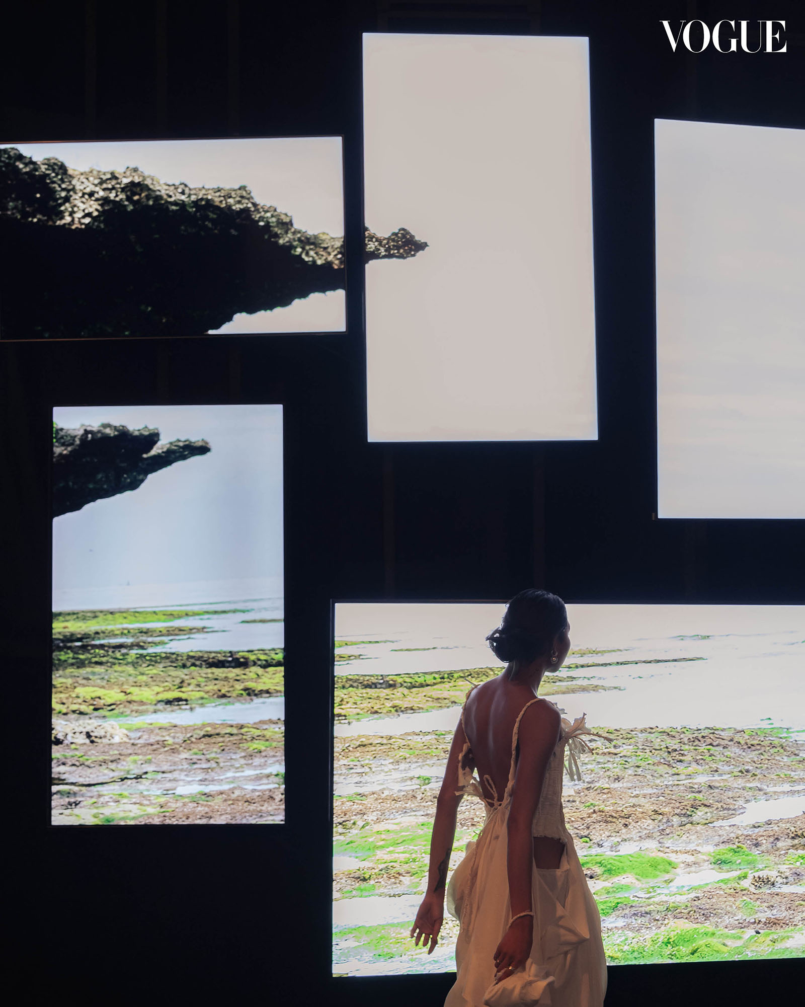 Upon entering, a cube-shaped portal transported visitors to the multiverse of Vogue 50 years from now. Creative director Vince Uy used generative software to create future fashion editorials, imagining three different scenarios, one where humans are clothed in bioluminescent life forms, one where biophilic architecture has reshaped the landscape, and one where we are armored for human survival on interplanetary terrain.
