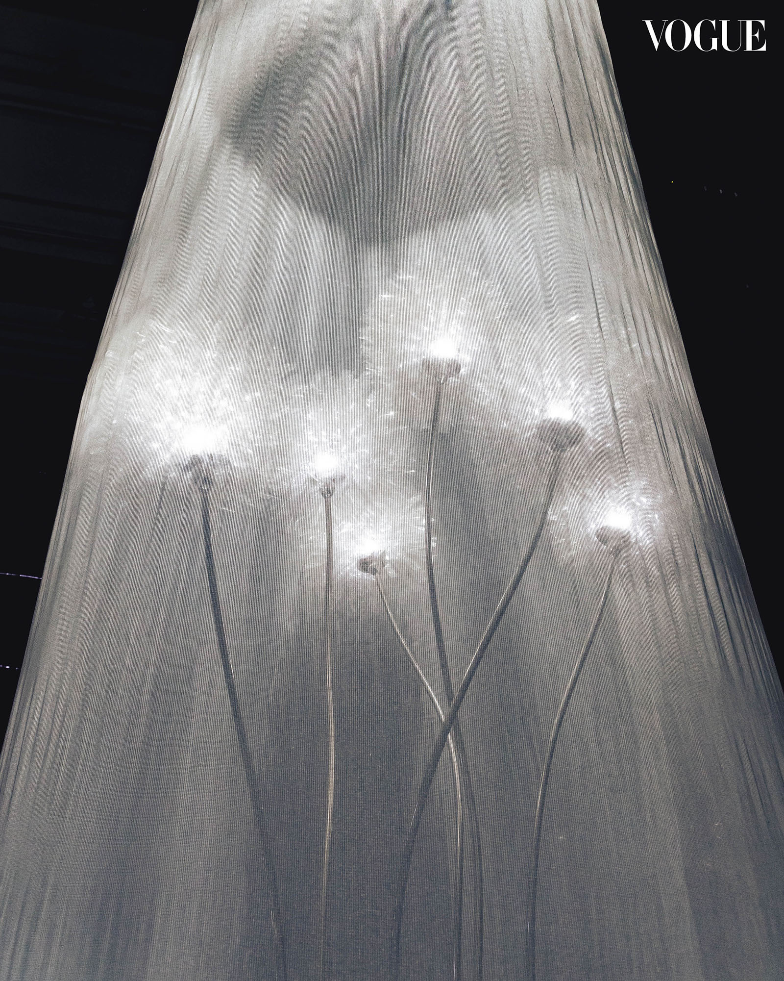Dispersed around the room are several other installations that bring to life the September 2023 issue and more. “Re: Create” explored the potential of upcycling with the heritage of traditional craft in works of art—Wawi Navarroza collaborated with the artisans of S.C. Vizcarra to create a poncho made out of hexagonally-patterned handwoven water hyacinth; Ken Samudio x Bagasao crafted a piece from upcycled denim, a vintage chair, and embroidered beads to evoke the overgrowth of nature; Olivia D’Aboville’s “Dandelion Lights” from 2016 were again illuminated, shedding light on the use of discarded plastic bottles; Rita Nazareno and Gabby Lichauco designed woven pieces inspired by the Emily Dickinson poem about the inescapable human-nature connection; and Patricia Perez Eustaquio stitched together a soft sculpture of a palm tree from offcuts of fabric and other recycled material.