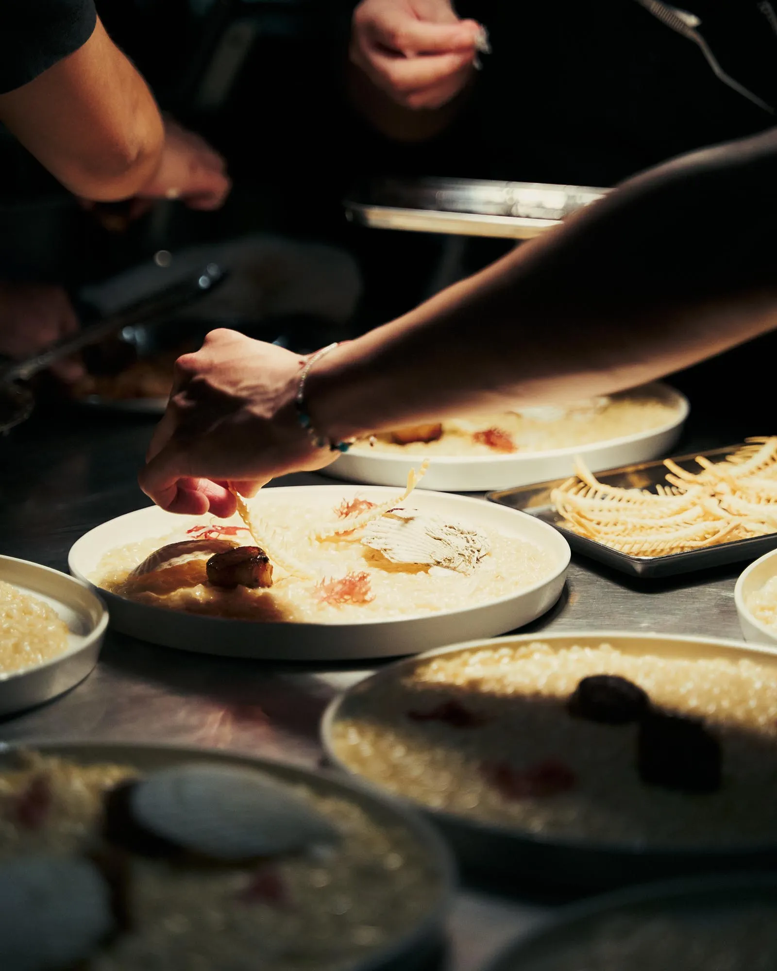 Along with the visual artwork comes a gastronomic experience, created by Now Now Canteen’s culinary team. In the four-course meal, they treated diners to different variations of rice dishes, while exploring concepts such as “height,” “width,” and “time.” Beginning with appetizers, they explored the concept of “height,” serving shrimp ceviche, taro dumpling, and rice noodle cannelloni, each perched on top of a metal platform of varying heights.