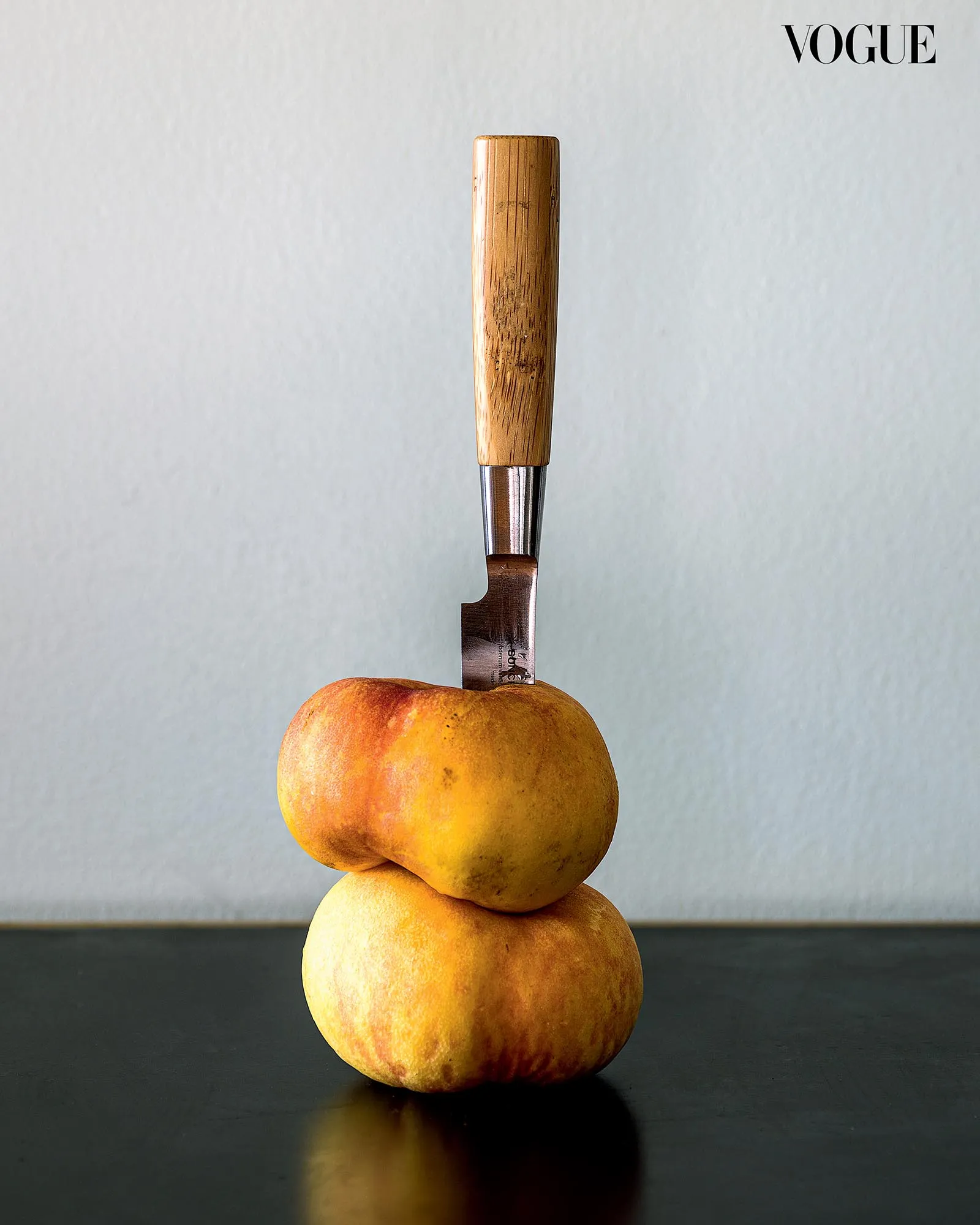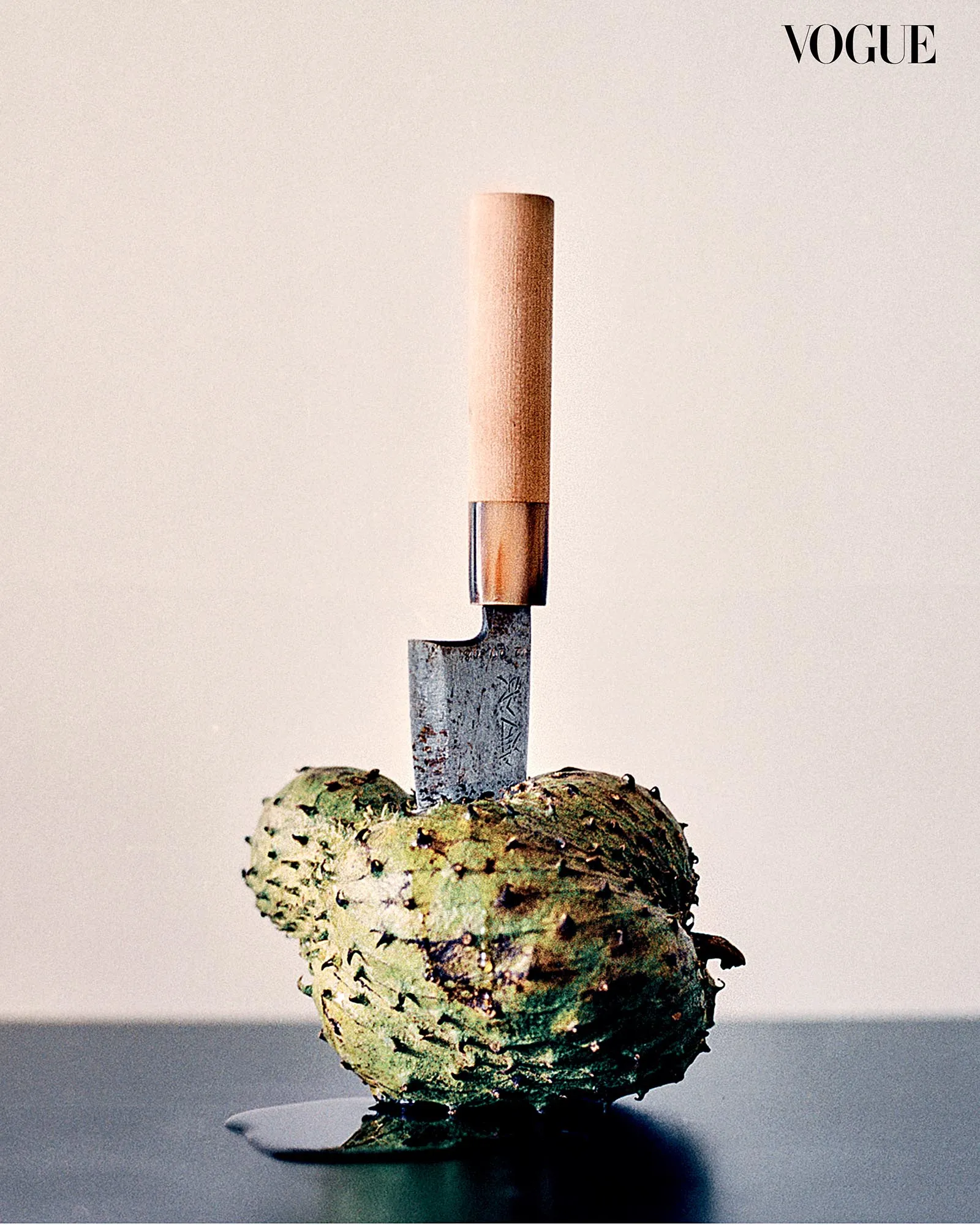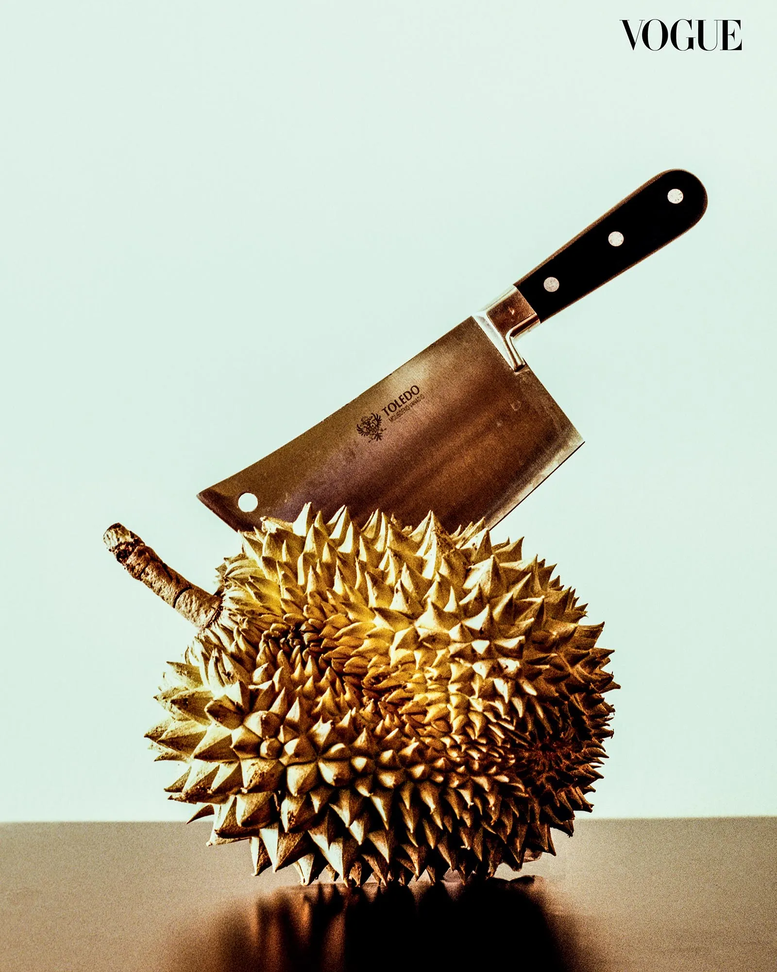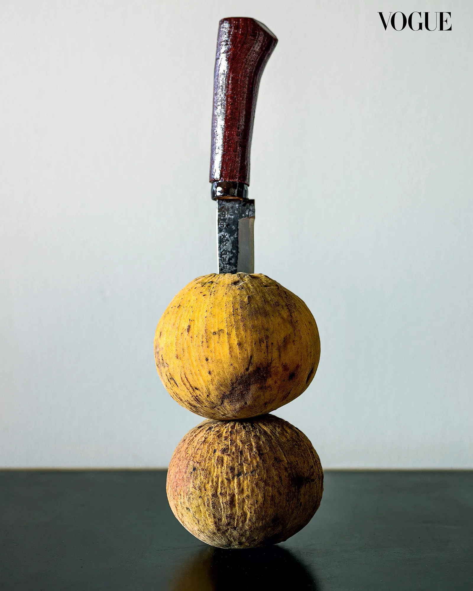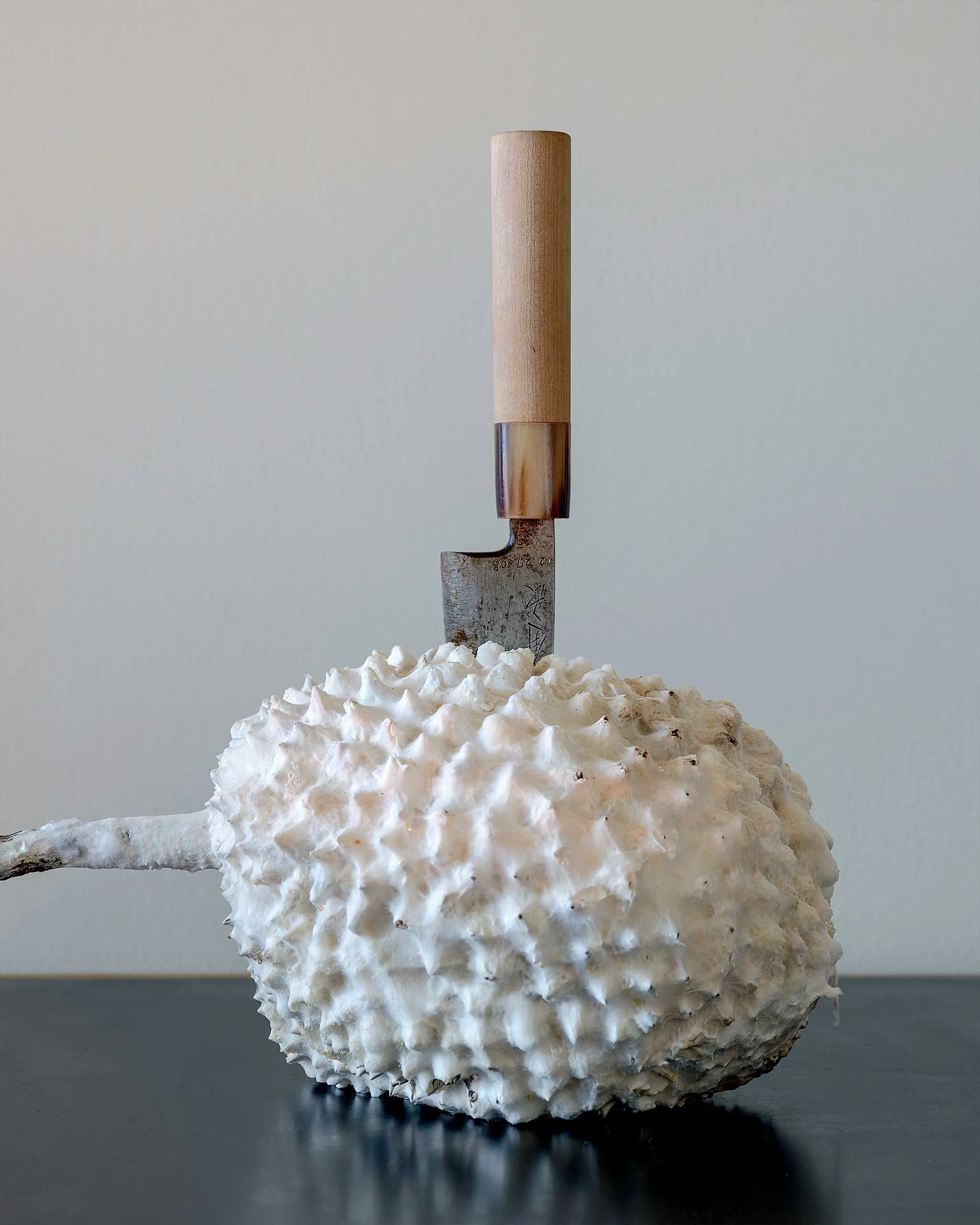 There’s a surgical precision to the way the knife is impaled in the center of the fruit, leaving it intact. Rather than slicing through the flesh, as a knife is supposed to do, it becomes part of the fruit, embedded in an assemblage of steel, skin, and wood. Dr. Benjamin Campomanes “Death to Fruits” series approaches classical still life composition with a contemporary, minimalist edge, conveying the sense of mortality in a memento mori. Created during the first year of the pandemic, the photographs began with the durian and cleaver, apt symbols of the healthcare workers who, despite all their protective armor, succumbed to COVID-19.