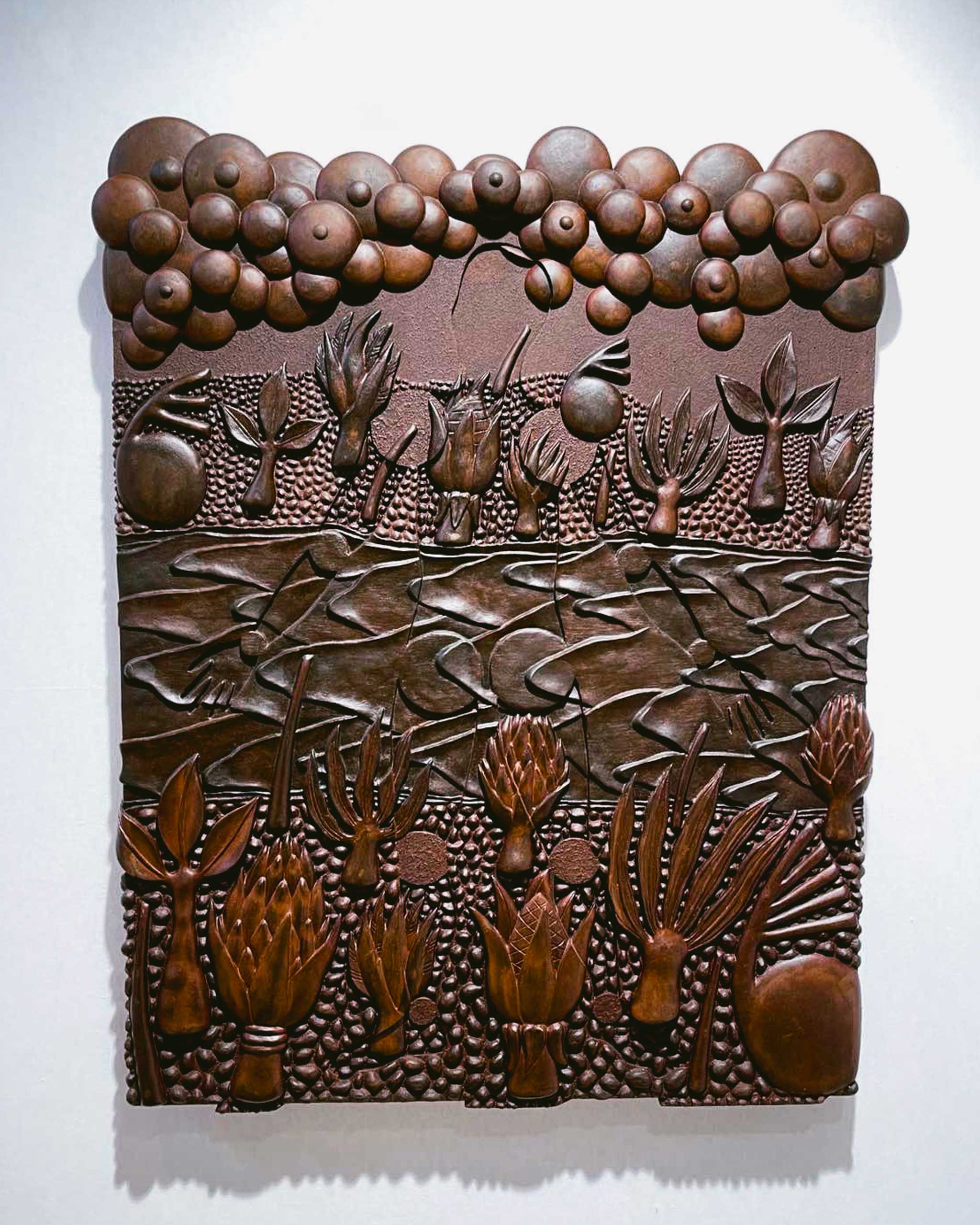 For the exhibit, the artist put together a collection of wall-bound works in relief. Sawdust, white glue, and leather varnish finish the intricate wood carvings. Each piece takes from Filipino myths that see life and death as a continuum, with the afterlife a natural progression from one’s earthly existence.