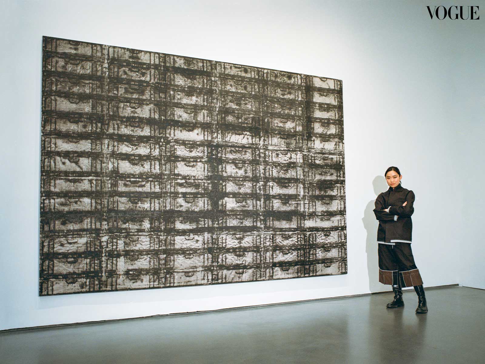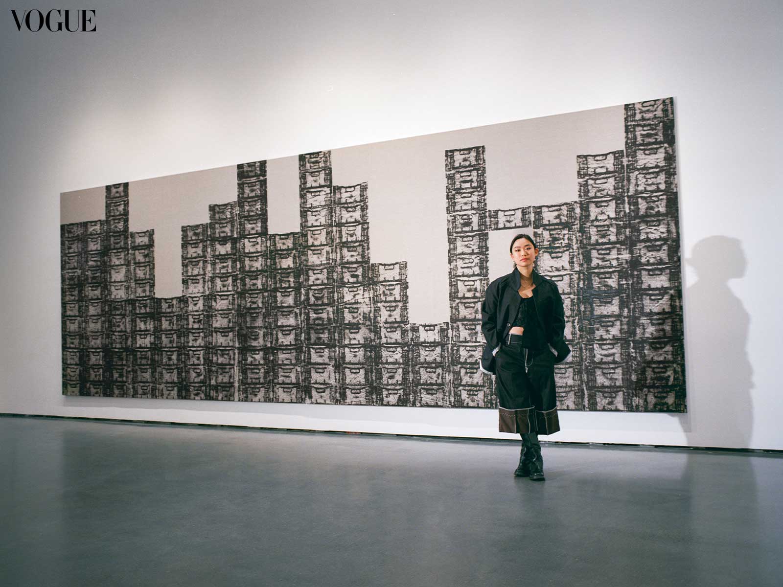 For the large painting in the show, I stacked the modules to create a suggestion of a vast cityscape whose surface and volume appear and disappear between lashings of thick black ink representing what was once there, only briefly, yet left a mark permanently. Its potential contents are withheld from the viewer but their weight and materiality are felt through their towering presence in the gallery.