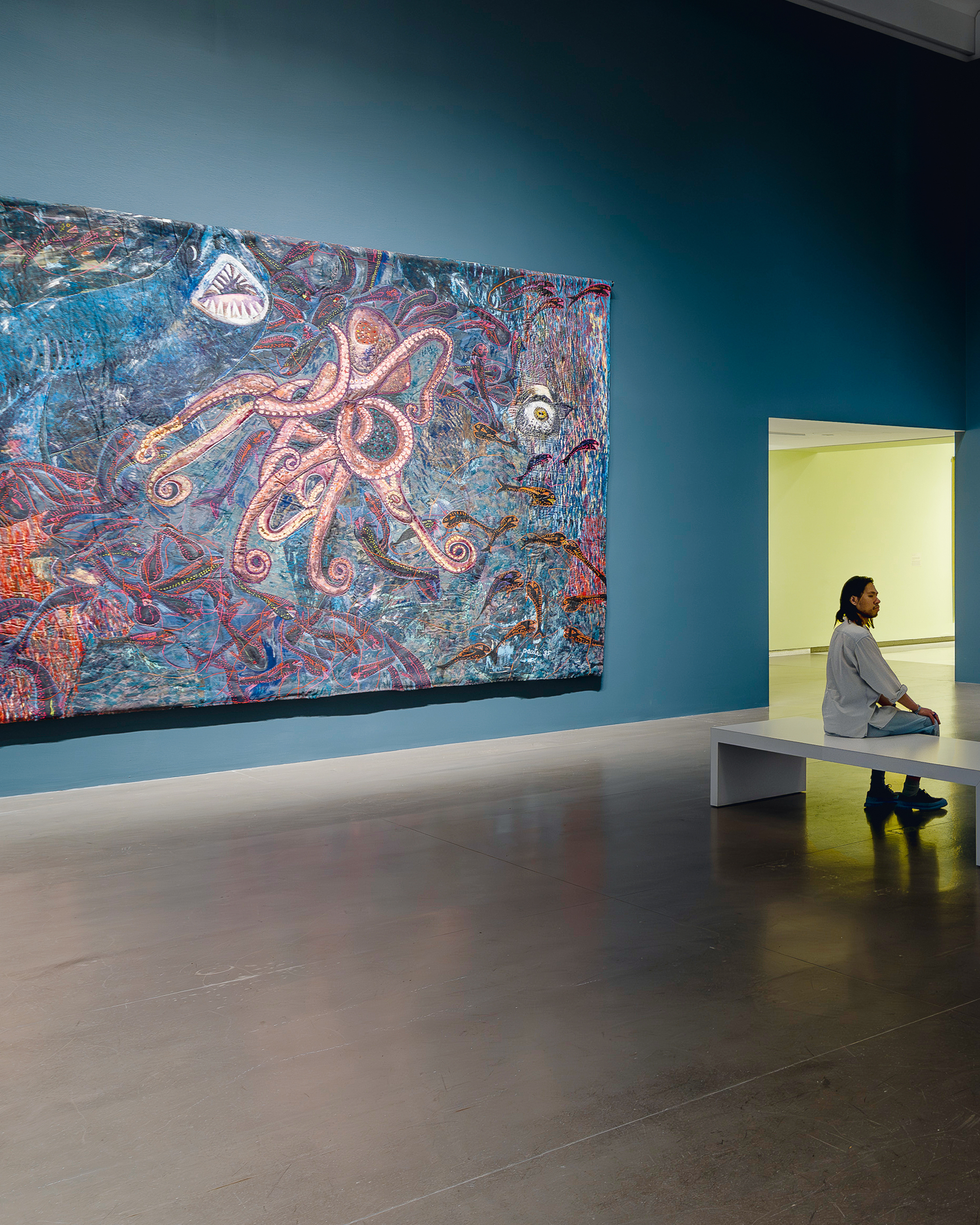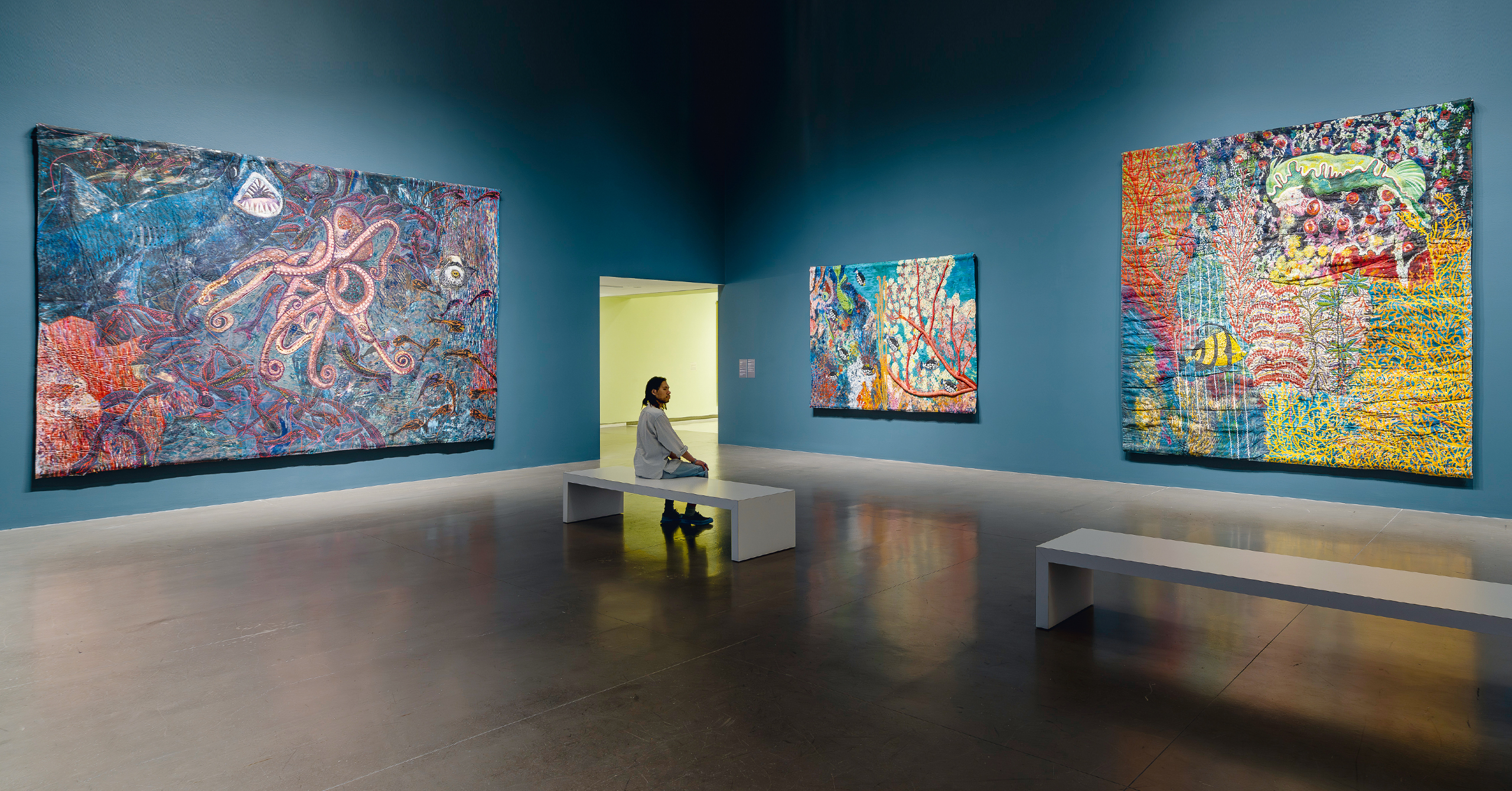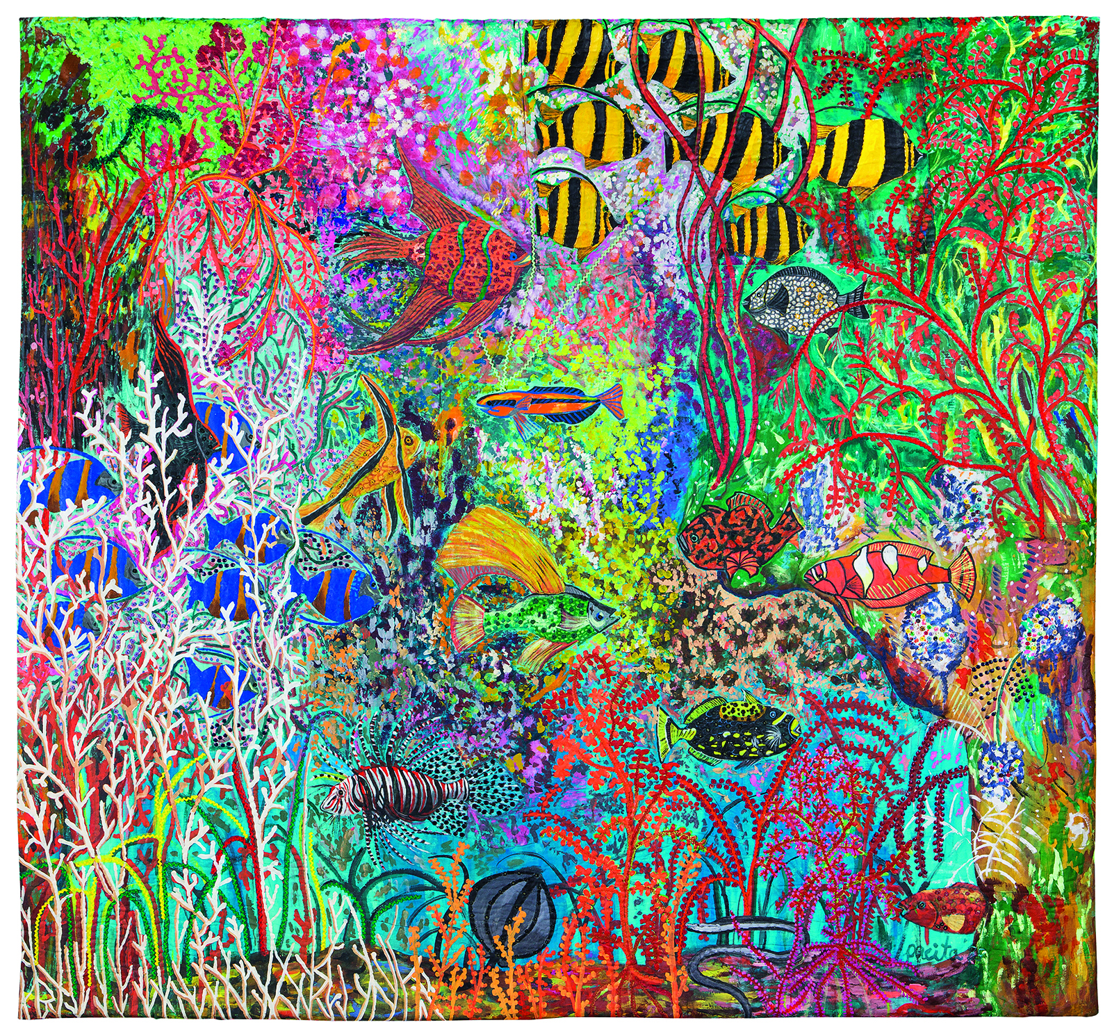 The final room in the exhibition transforms the cathedral-like Herzon and Meuron designed space into an underwater Philippine paradise, taking the viewer through a journey of the country’s coral reefs in Puerto Galera, Dumaguete, and Apo Island with an overwhelming profusion of canvas, ribbons, buttons, glitter and paint. Produced during the politically tumultuous period during and immediately after the fall of the Marcos dictatorship, Pacita’s underwater wilderness suggest both her need to rediscover her place of birth after years of being away and her insistence on finding beauty underneath its turbulent surface.