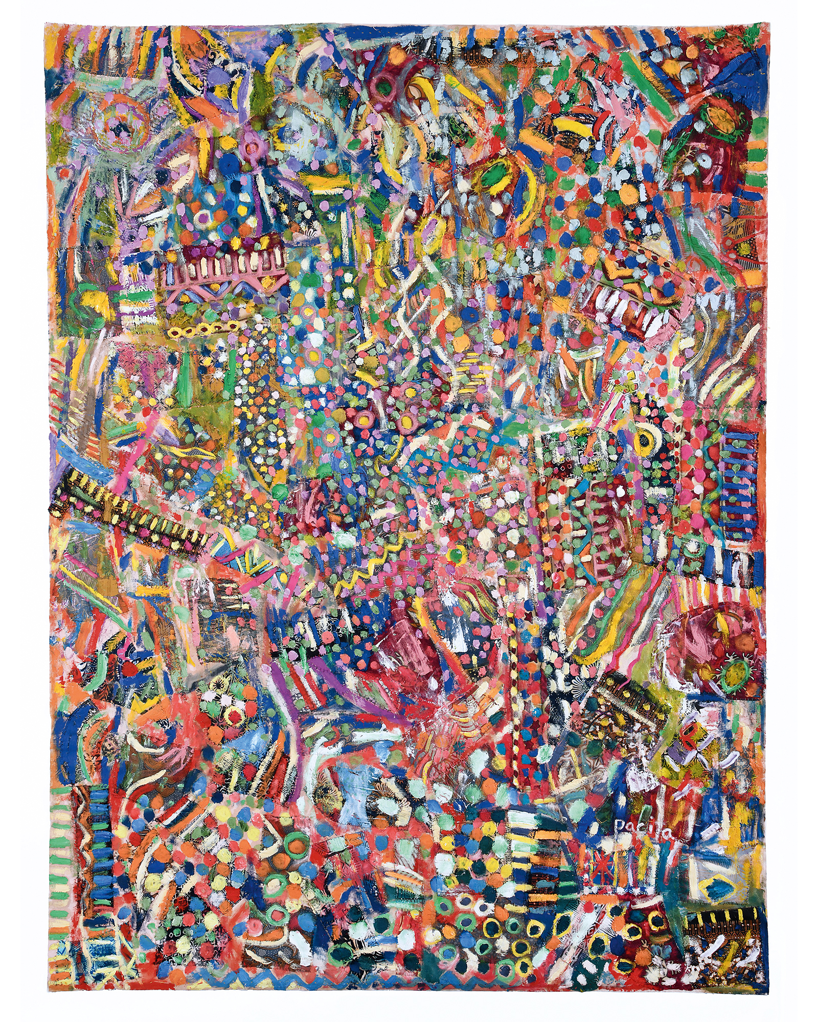 The austere white spaces of the museum were transformed into a multi-hued environment. The staircase leading up to the exhibition was swathed with the frenetic golden yellow polka dots of her 2002 painting “I Have One Million Things to Say,” the walls of the galleries rendered in blush pinks, warm yellows and greens, and deep berry reds. The retrospective, thoughtfully curated by Victoria Sung with the assistance of Matthew Villar Miranda, brings together over a hundred artworks produced over a breathtakingly prolific 32-year artistic career that saw her live in over 60 countries across six continents, making more than 5,000 works in the process. Pacita is best known for her “trapuntos,” a term she coined for her large-scale paintings on unstretched canvas that were quilted, embroidered, and embellished with assorted materials. Her trapuntos not only showcased her skills as a material omnivore, but also incorporated the techniques that she learned from the different communities she encountered throughout her travels: Rajasthani mirror embroidery, Papuan cowrie shell ornamentation, Korean ink brush painting, and Indonesian batik, among others.