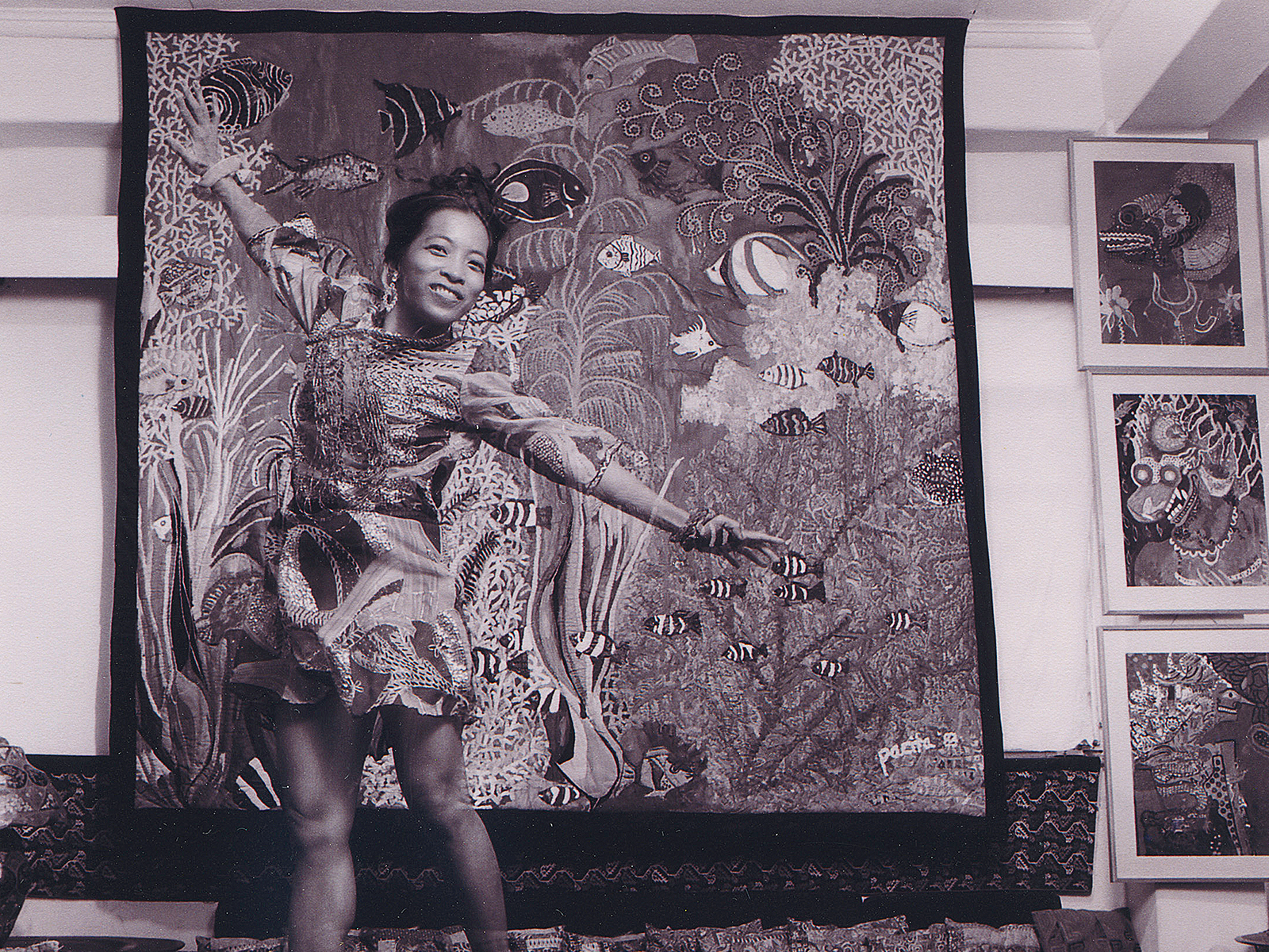 At the 1986 opening of her exhibition at the Ayala Museum, where she transformed a museum into an underwater environment for the first time, she arrived wearing a full scuba diving outfit complete with flippers and an oxygen tank. After the ribbon cutting ceremony that traditionally marked her openings, the massive raffia and satin ribbons would be reconfigured as part of her already outrageous outfits. I have distinct memories of Pacita clad in an Issey Miyake dress with a hand-painted depiction of an amorous and fully nude couple, first worn at an opening in SM Megamall and subsequently to a walk down the aisle as godmother at a cousin’s Catholic wedding.