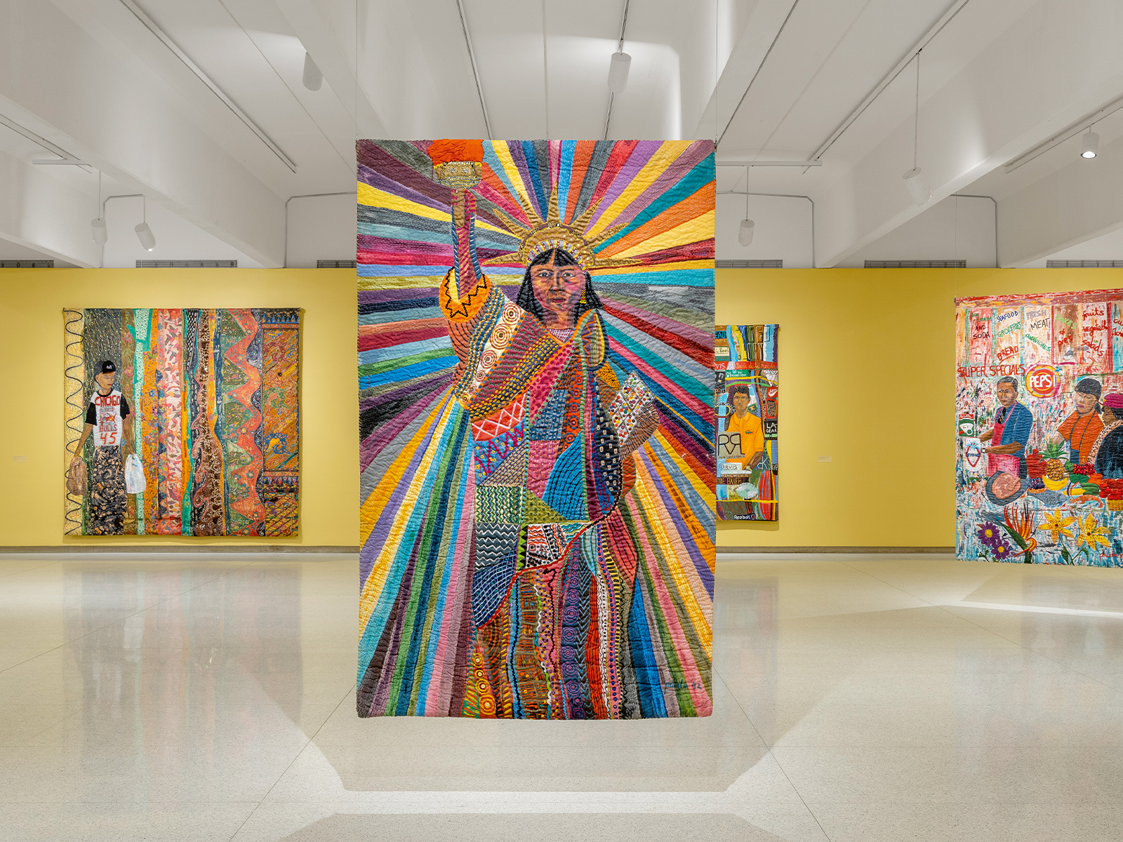 The series “Six Masks from Six Continents,” initially commissioned by the Washington D.C. Metro and installed in the cavernous hall of the central train station of the nation’s capital from 1990 to 1993, is reunited at the Walker for the first time in three decades. The work celebrates the growing diversity of the United States, commemorating the demographic shifts in the country through Pacita’s colorful lenses and drawing inspiration from ceremonial masks from around the world. The writer Murtaza Vali poignantly refers to them in a recent Artforum magazine feature as “icons of global indigeneity.”