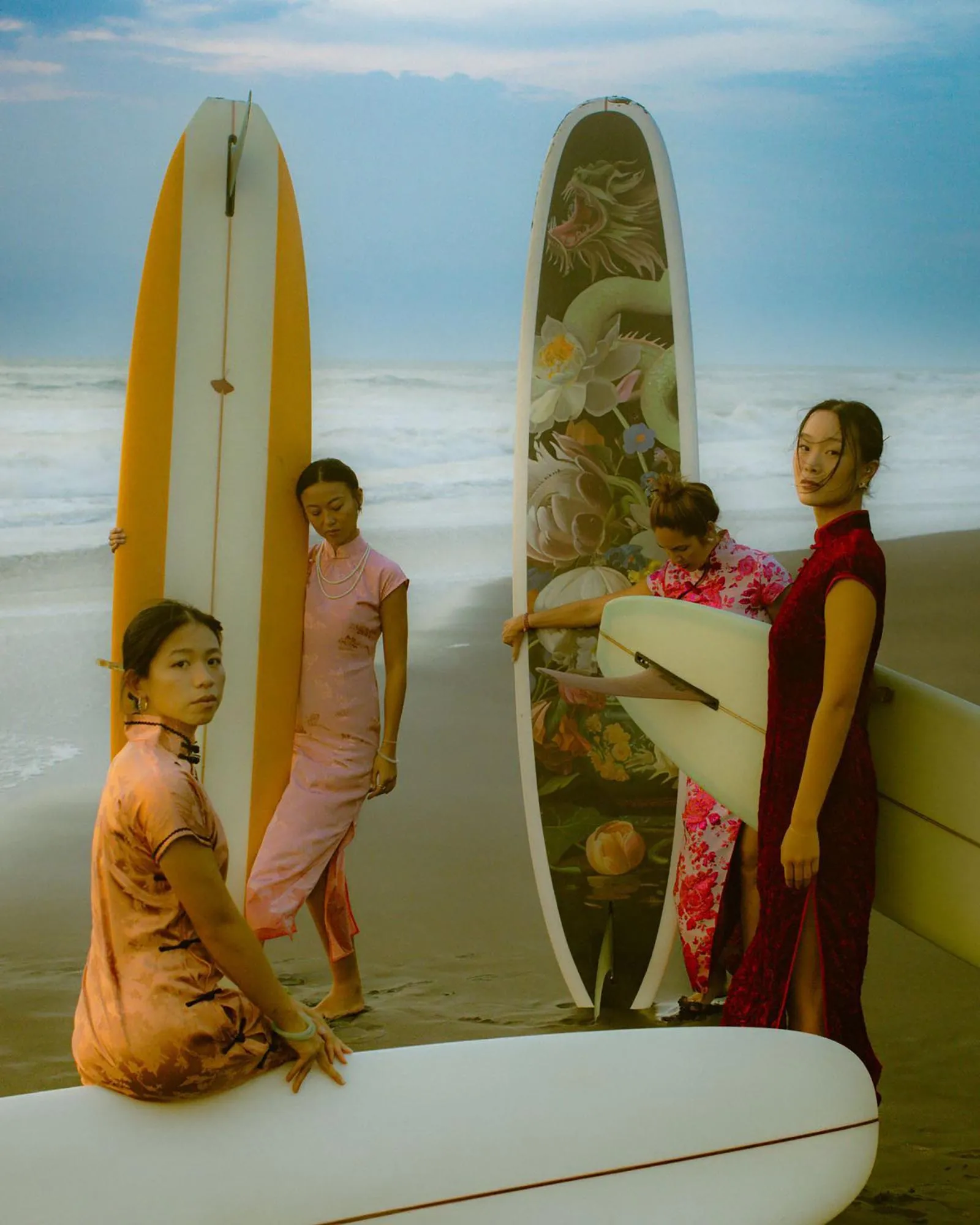 This photograph is part of the series Pearls. The Pearls Project by Archie Geotina is a multidisciplinary photo series that celebrates the strength and heritage of women surfers across coastal Asia. Set against the backdrop of the ocean, the women wear traditional attire, transforming cultural garments into living expressions of freedom and identity. While the surf action is captured in collaboration with local photographers, all land-based portraits are photographed and directed by Geotina himself, blending fine art and cultural documentation.