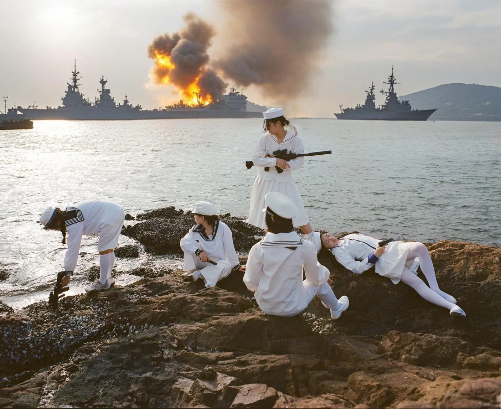 This photograph is part of the series The White Barracks, which focuses on the fractures within power structures. Lui imagines a fictional island inhabited by a battalion of girl cadets engaged in constant military drills. Each day, the girl cadets watch their comrades engulfed in distant artillery fire, longing to be equipped for the battlefield. In a cave, a collection of sculptures made from leftover war materials documents the spiritual lives, beliefs, and desires once held by this battalion amidst the flames of war.