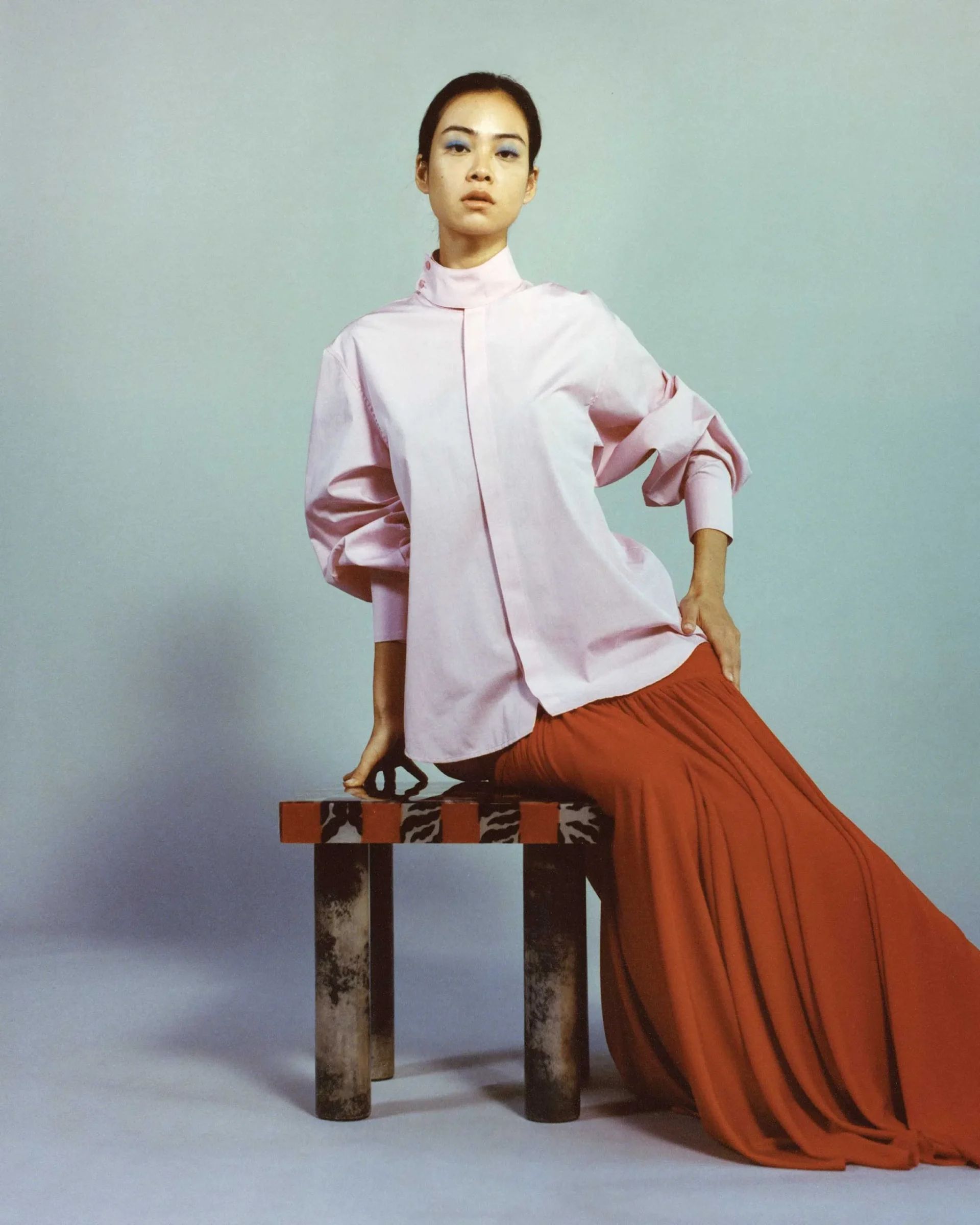 Shone studied fashion at the Antwerp Academy of Fine Arts, whose notable alumni include Dries Van Noten and the rest of the Antwerp 6, Martin Margiela, and Demna Gvasalia. He works extensively with Thai silk and other Thai textiles, but also sources fabrics from varied locales. “Material is central to my process. I’m always playing with color and combining different materials in unexpected ways. Many of the pieces are unisex — that’s intentional. I like pushing the boundaries of familiar fabrics. Denim, for example, that I needle-punch — the threads are literally scratched out to create a textured surface.”