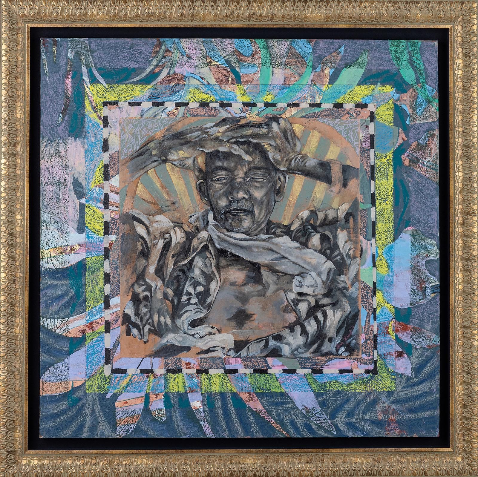 While the two artists presented their individual works in the exhibition, their collaborative pieces are significant. Heussaff-Bolzico and d’Aboville sent the pieces back and forth to each other, lifelong friends offering each other commitment and dedication. The result are pieces that are marriages of both their styles: the “Vergere” series, for example, involves a painting by Heussaff-Bolzico printed over yards of fabric, then pleated by d’Aboville. On a circular canvas, d’Aboville pleats abaca polyester textile over Heussaff-Bolzico’s acrylics and pastels in “Motus.”