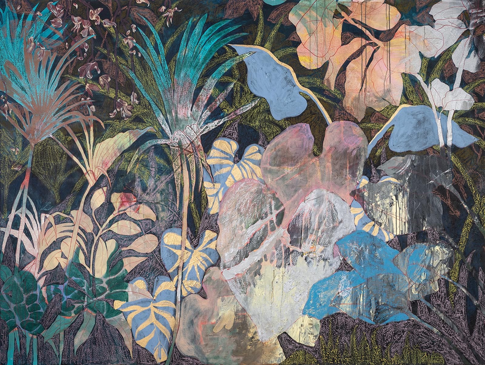 Curator Stephanie Frondoso was inspired by magical realism, a genre of fiction associated with blurring the lines between fiction and reality. “They want to celebrate or pay homage to the complexity of nature, but also the complexity of humans’ relationship with nature,” she says about the artists’ work. Heussaff-Bolzico, who started her career as an artist creating social realist paintings, veers into surrealist, visually anti-organic work for this exhibition, portraying nature in forms and colors that feel alien yet familiar.