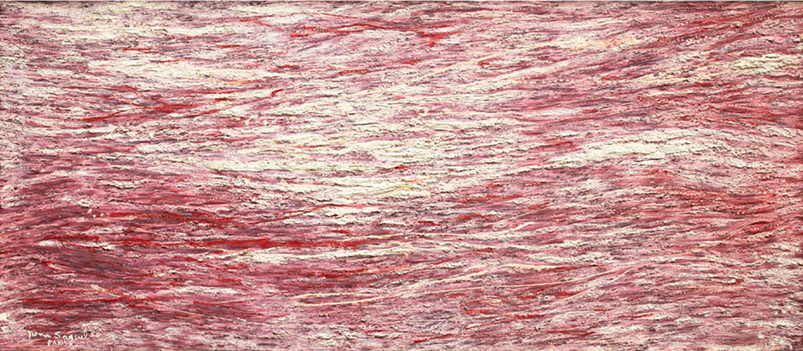Nena Saguil, a classmate of Anita Magsaysay-Ho at the UP School of Fine Arts, was part of the modernist Neo-Realist group of Filipino painters. She would veer into abstraction and became a pioneer in that field, her art reflecting her interest in mysticism and the cosmos, visualized most notably in her dot paintings. Somewhat of a recluse, she spent the last 40 years of her life in Paris. “Composition Red,” made in Paris a few years after moving to France to study Abstract Non-Objective Art, is considered a prime example of Saguil’s bold form of abstraction. Using impasto, the piece appears to move viscously. Olivia Yao, a former banker and publisher of the book Art After War: 1948-1969, is a collector of the avant-garde. She once described her collection as “not safe, extreme, and adventurous.” She has also said that collecting art is an evolving process and should not remain stagnant. In letting go of this painting, Yao is passing along its primal energies to whoever gets swept up in its flow next.