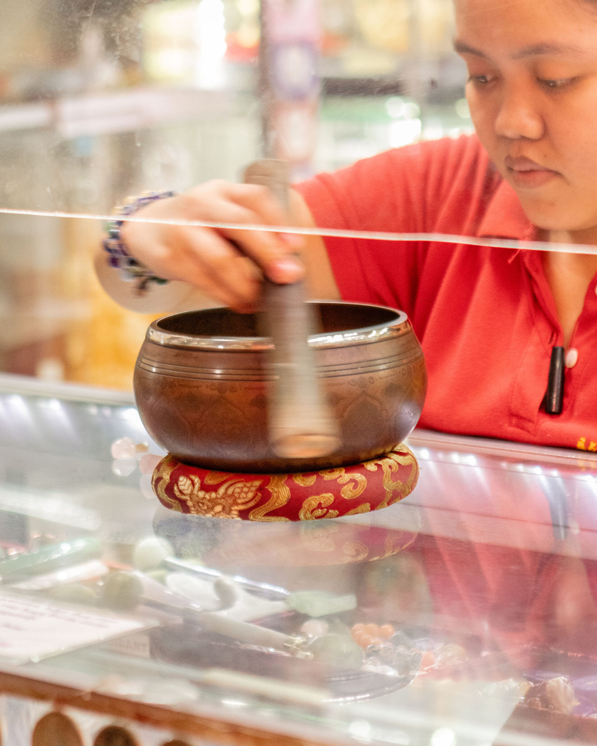 A shop vendor performing sound cleansing. Photo by Dom Pamatmat