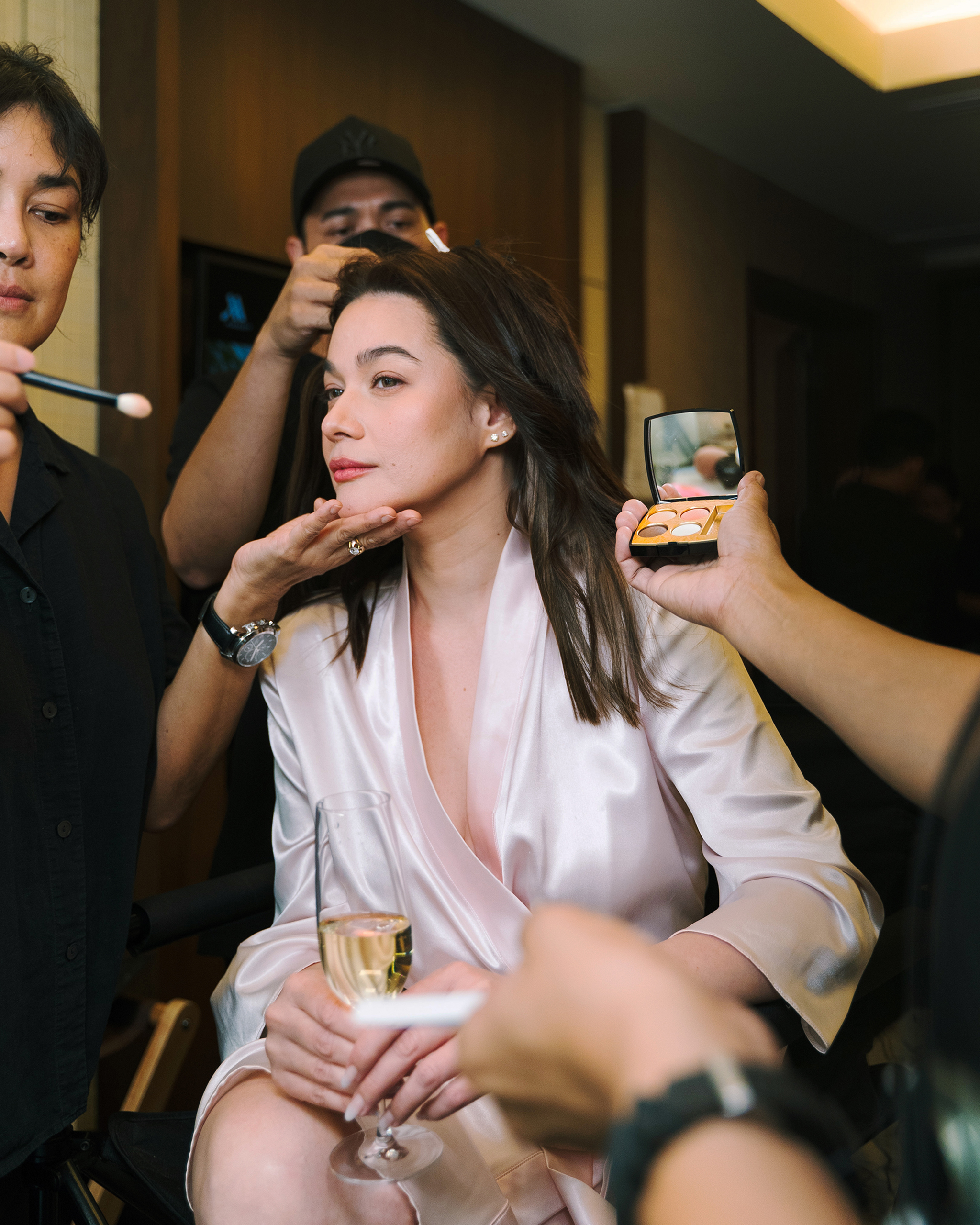 The star is all smiles as she sits in her hair and makeup chair, joking and laughing along with her team, who are all packed tightly in her Marriott Hotel suite. On getting done up for big events, she shares she’s learned to love the ritual as it means she’ll get to see the people she’s grown close to throughout her career. “I like seeing friends—old and new.”