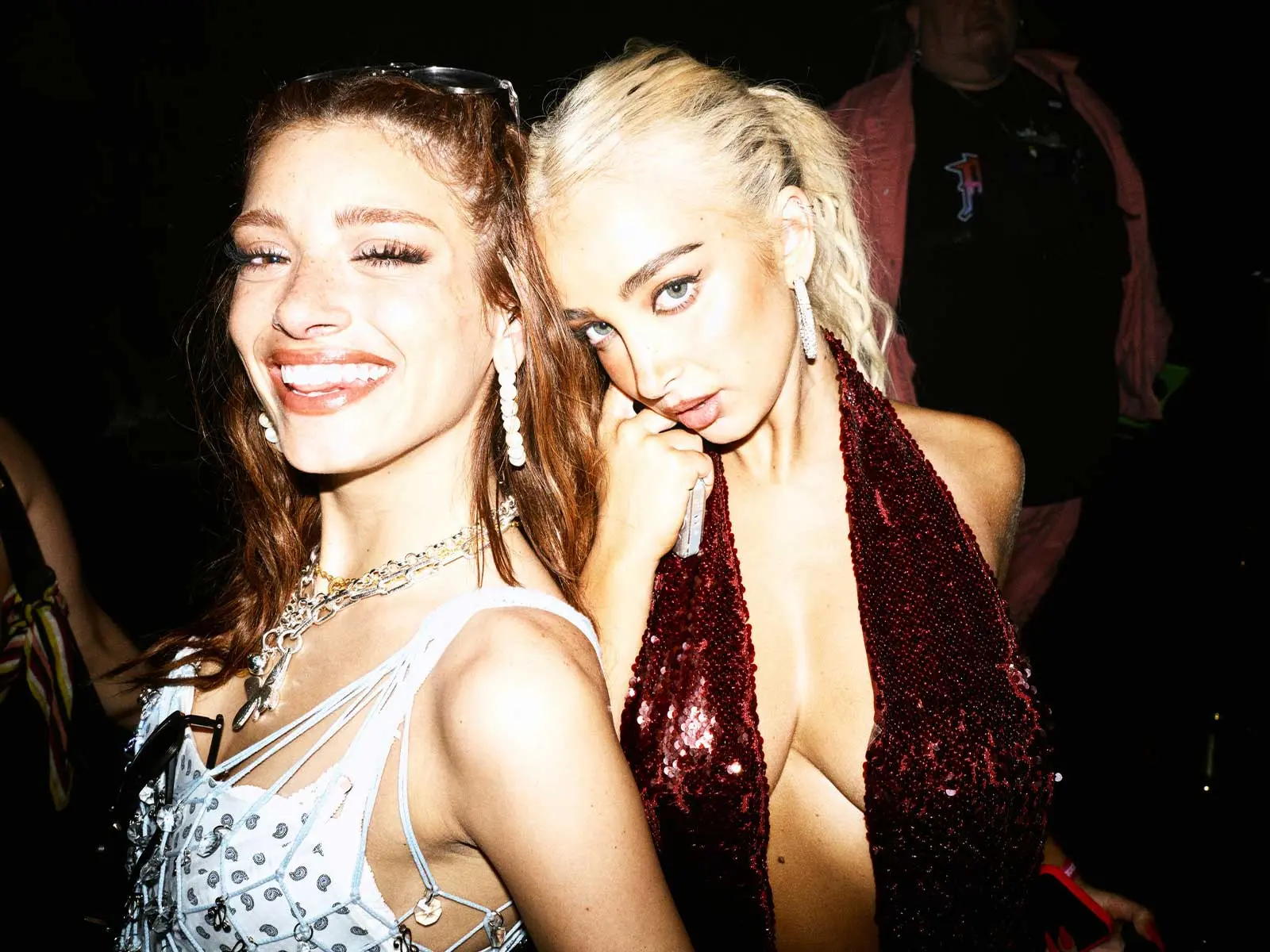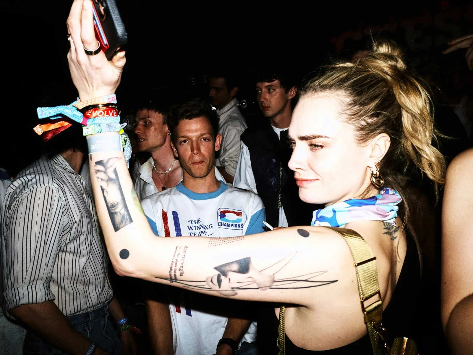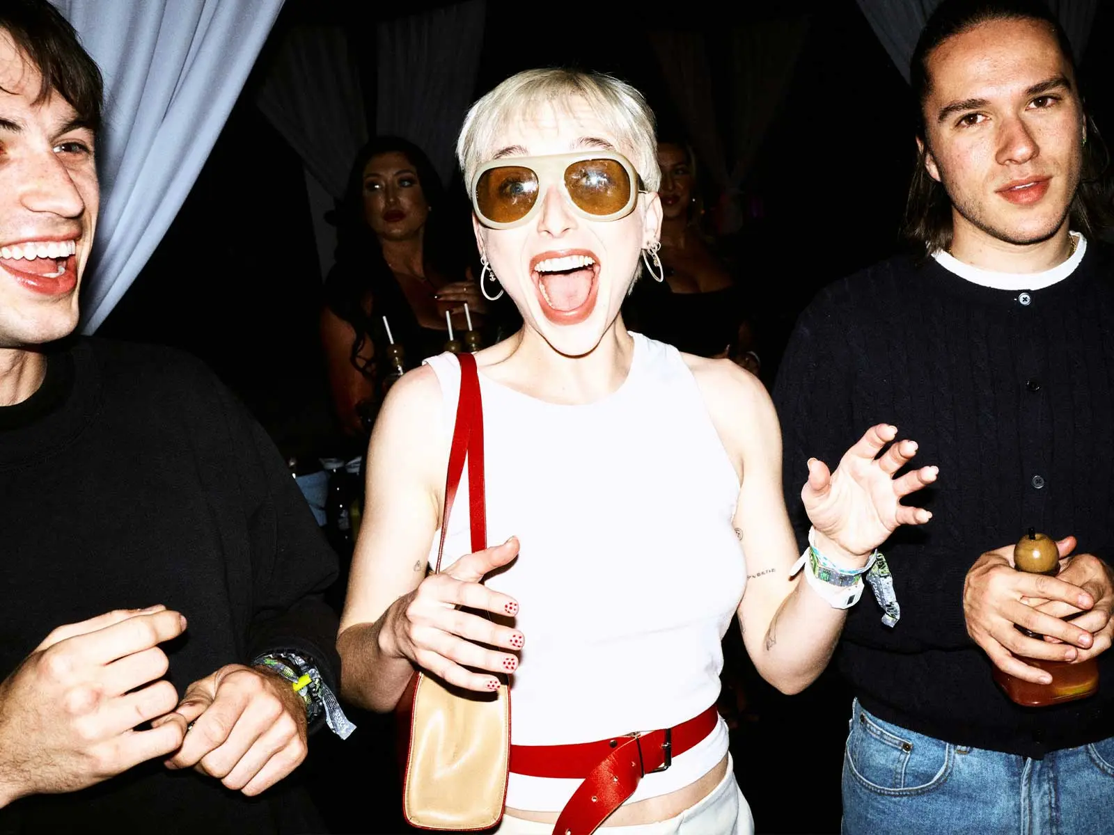 Inside the private Guess house, the invite-only crowd mingled while sipping craft cocktails by Patron El Alto and Gin & Juice. In one corner, fashion It girls like Alex Consani, Julia Fox, Richie Shazam, and Cara Delevingne gathered under the open-air cabanas, while Hollywood A-listers like Joy, Chalamet, and Leonardo DiCaprio congregated in another buzzy corner. (All keeping a low profile, of course.) Naturally, some buzzy music names were also in the mix: The Dare, Troye Sivan, and Clairo were among those in the starry crowd.