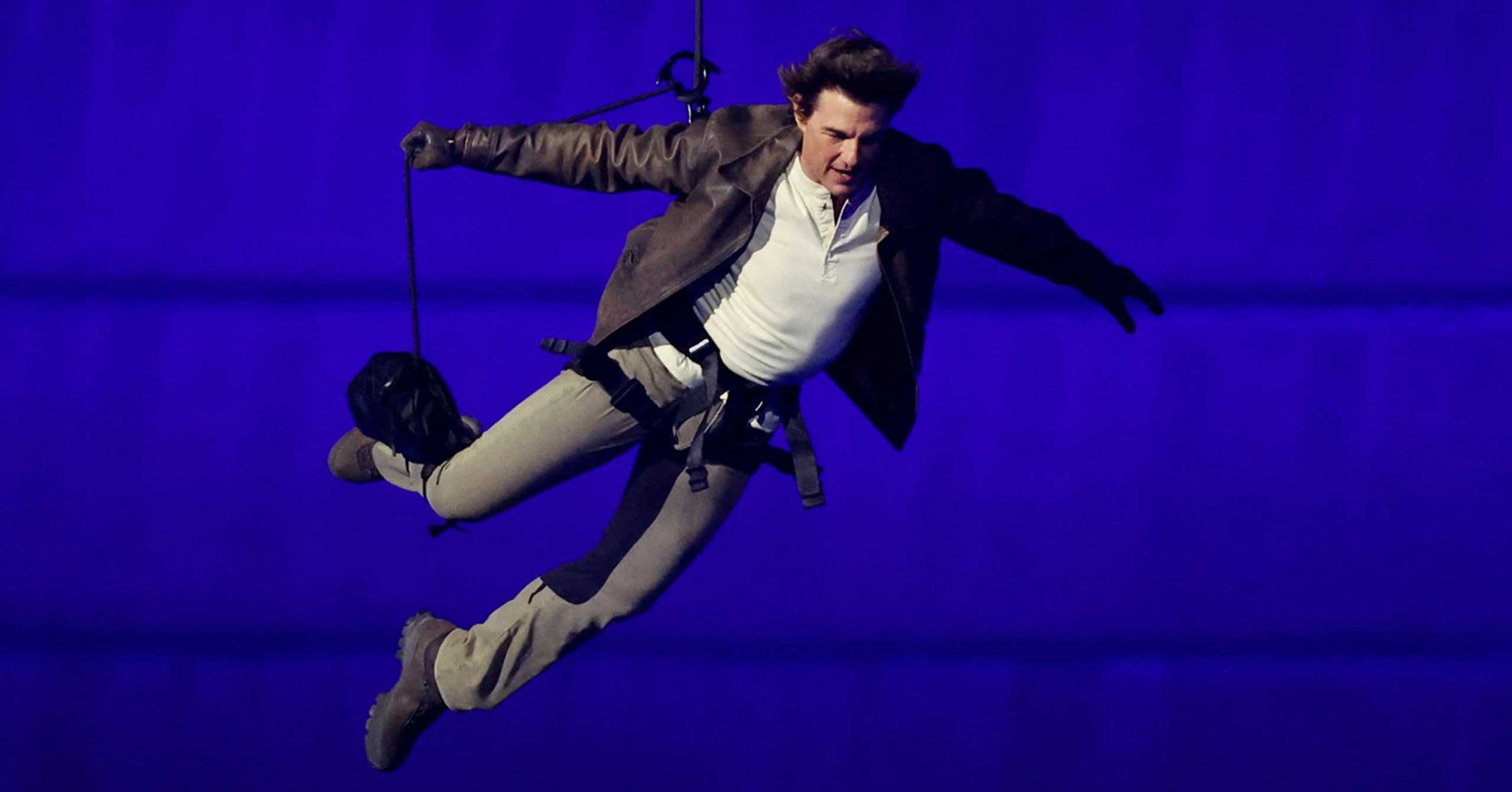 Then, one of America’s greatest action stars, Tom Cruise, flew in from the stadium roof (naturally). After shaking hands with some adoring fans, he climbed onto a motorcycle—with the Olympic flag in tow—and zoomed out into the night. At that moment, the broadcast cut to a pre-taped video showing Cruise as he biked, sky-dived, and parachuted his way from Paris to LA, where he proceeded to add the iconic Olympics rings onto the Hollywood sign.
